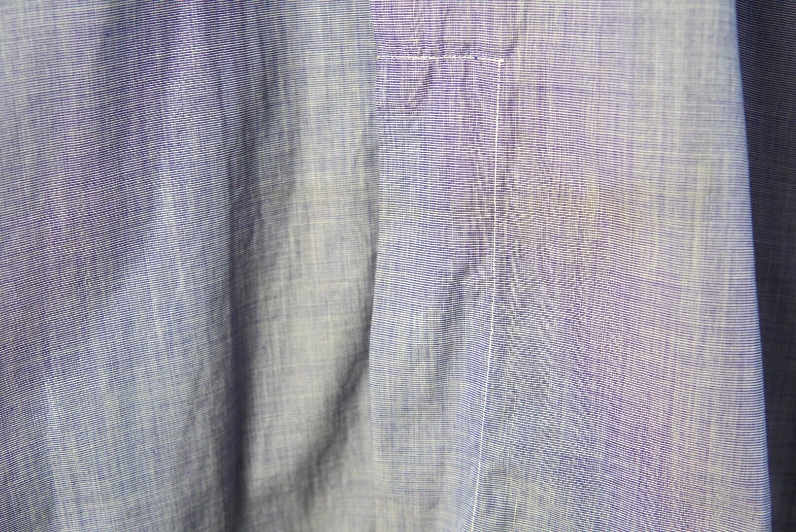 生地はサックスとホワイトの2色の後で織られた刷毛目。ハリとツヤのあるなめらかな肌触り。