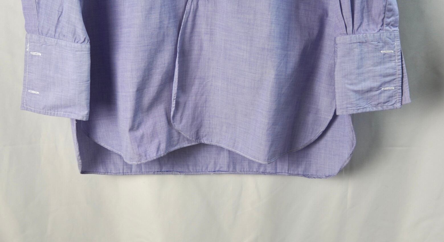 カラーレス仕様、ダブルルカフス、ラウンドテール、マチ付き。