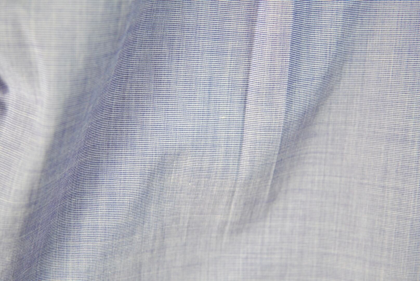 生地はサックスとホワイトの2色の後で織られた刷毛目。ハリとツヤのあるなめらかな肌触り。