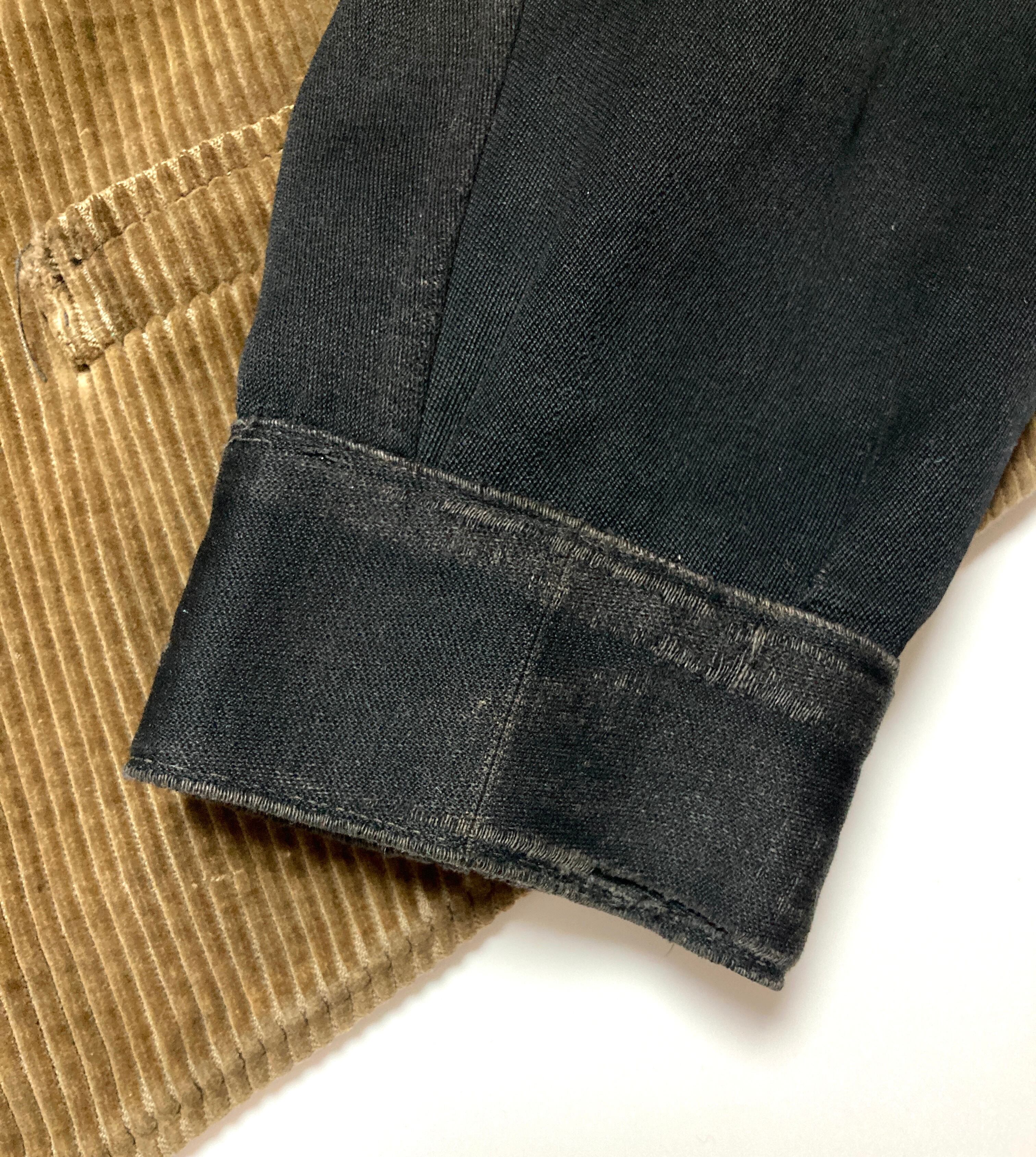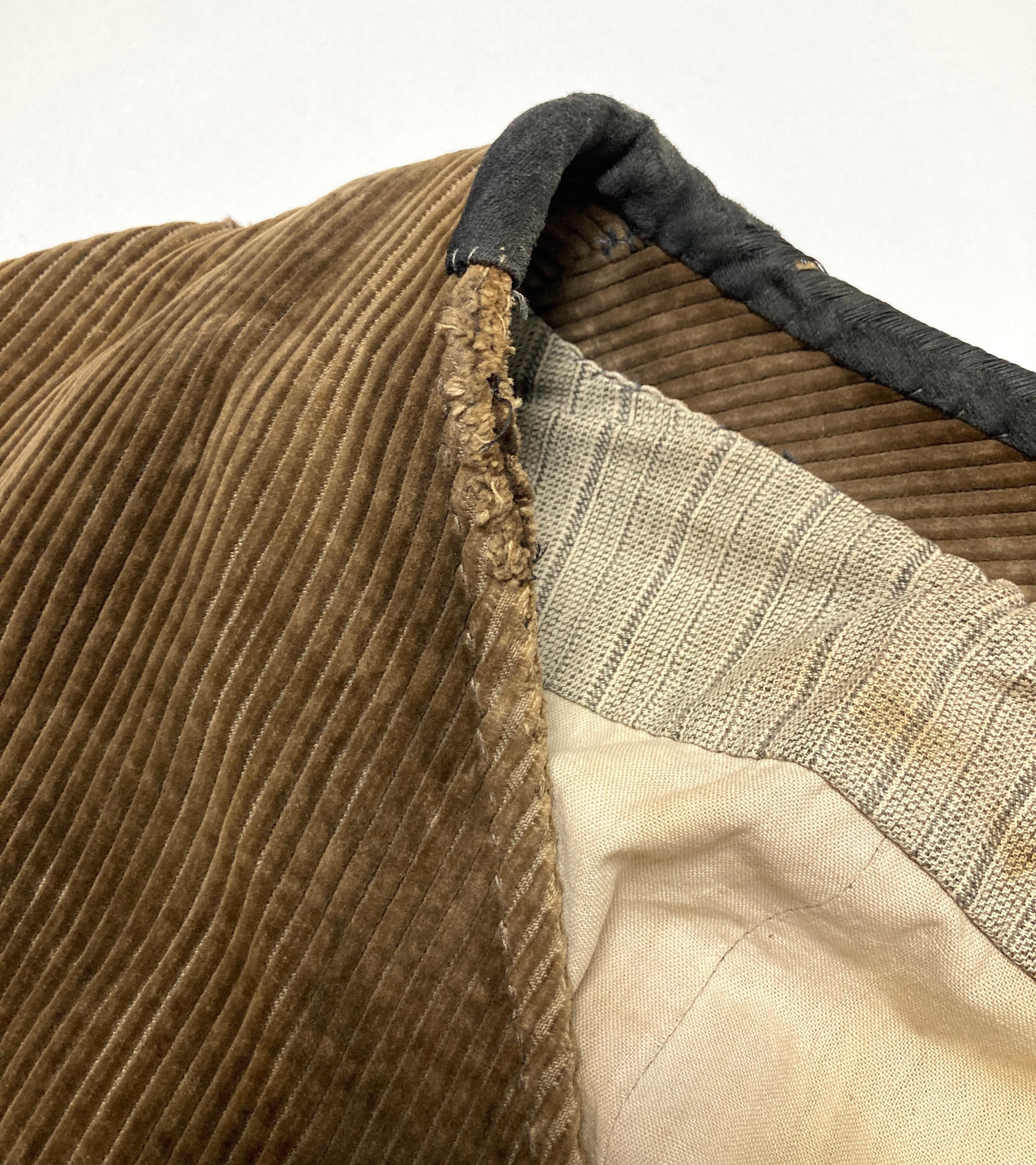 前見頃は太畝のブラウンコーデュロイ。前合わせの辺りで生地が2枚になっています。背と袖はブラック・コットンサテン。