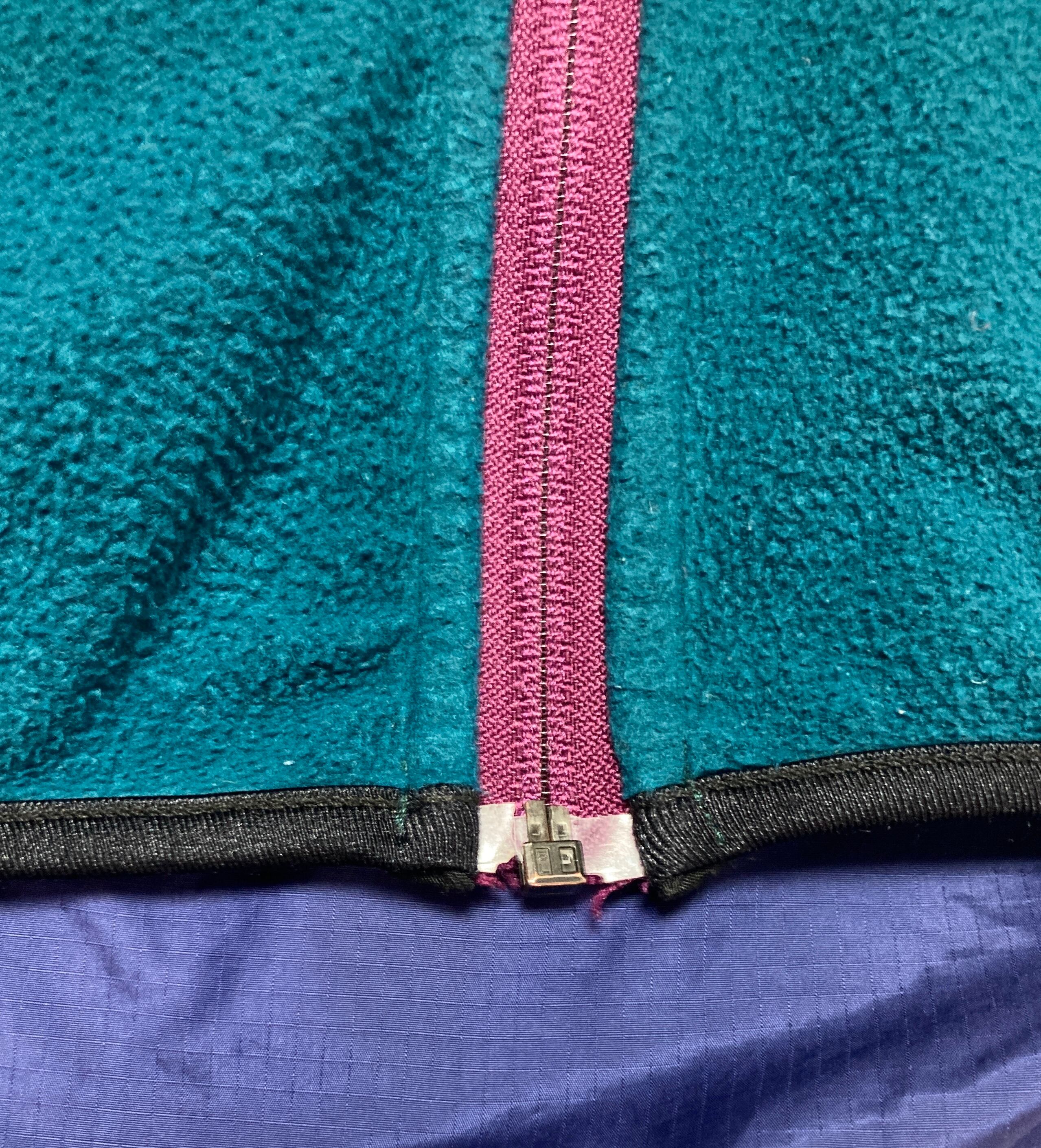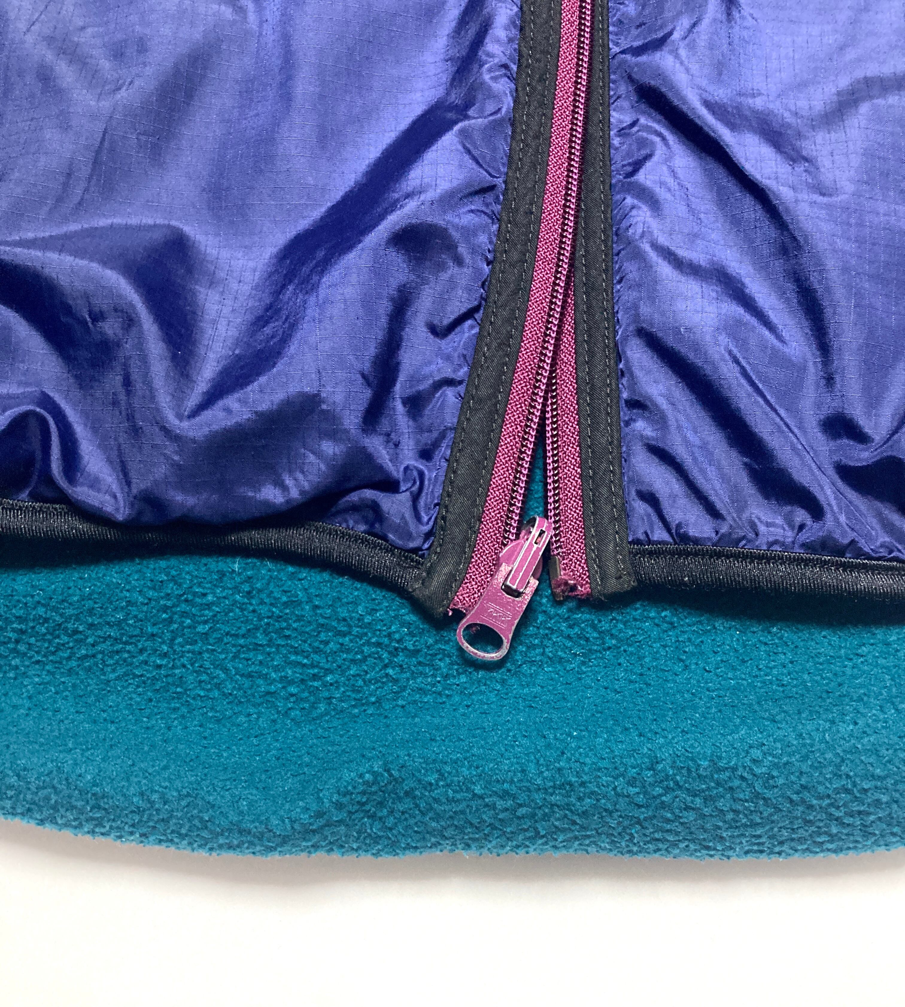 パープルのナイロンに、グリーンのフリースの裏地。