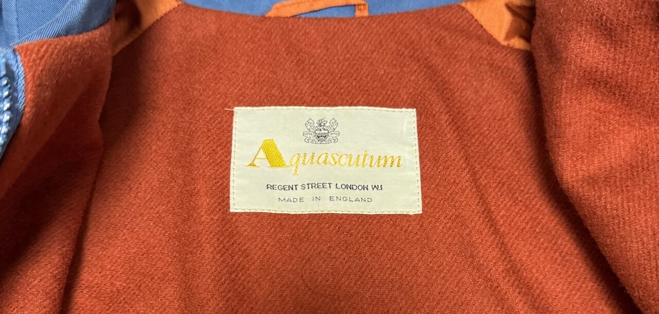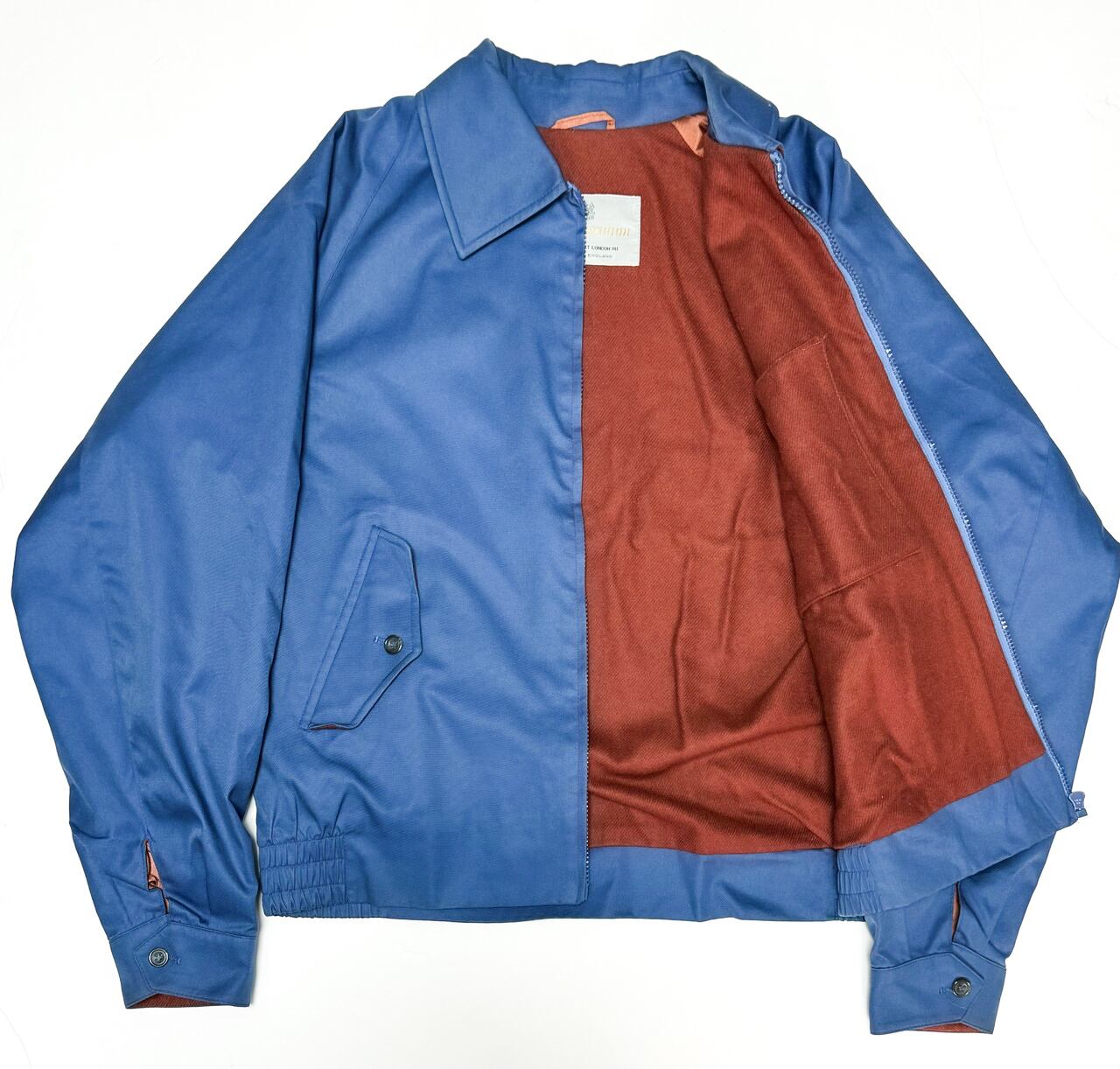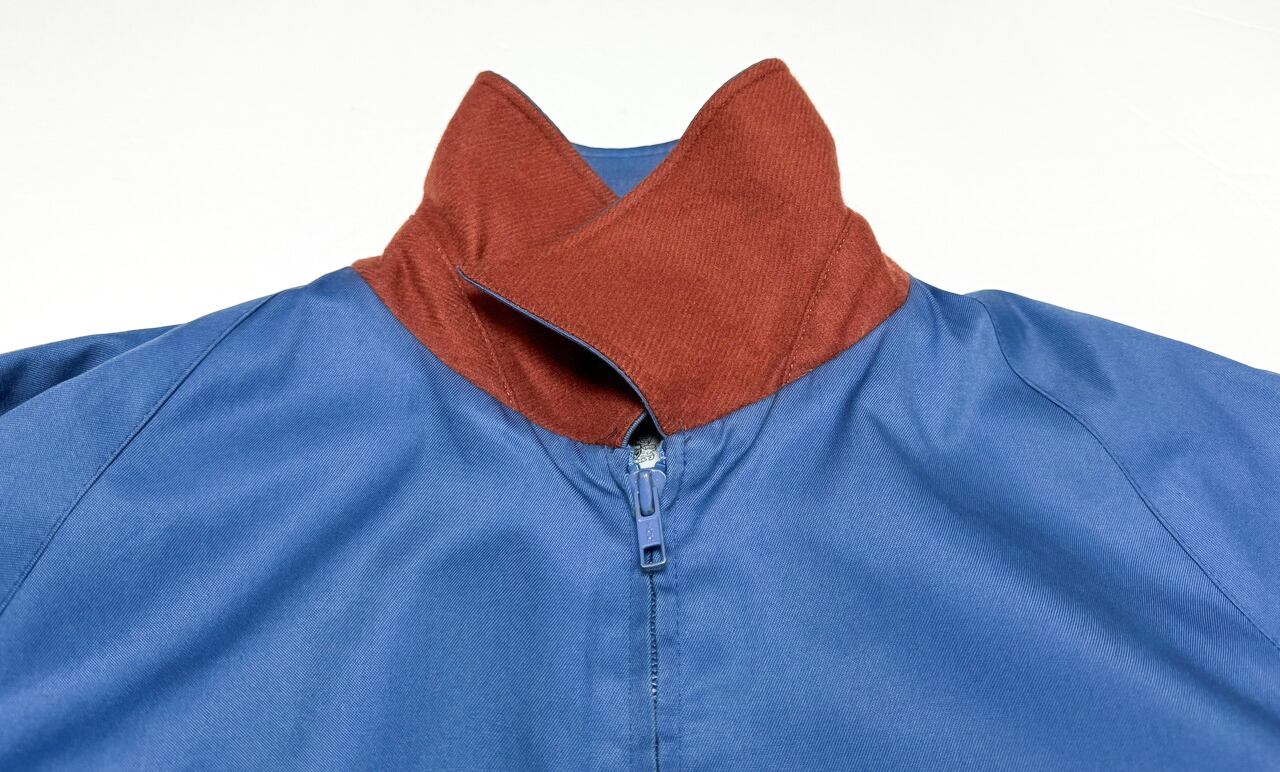 鮮やかなブルーに、レンガ色のウールの裏地という珍しい配色。