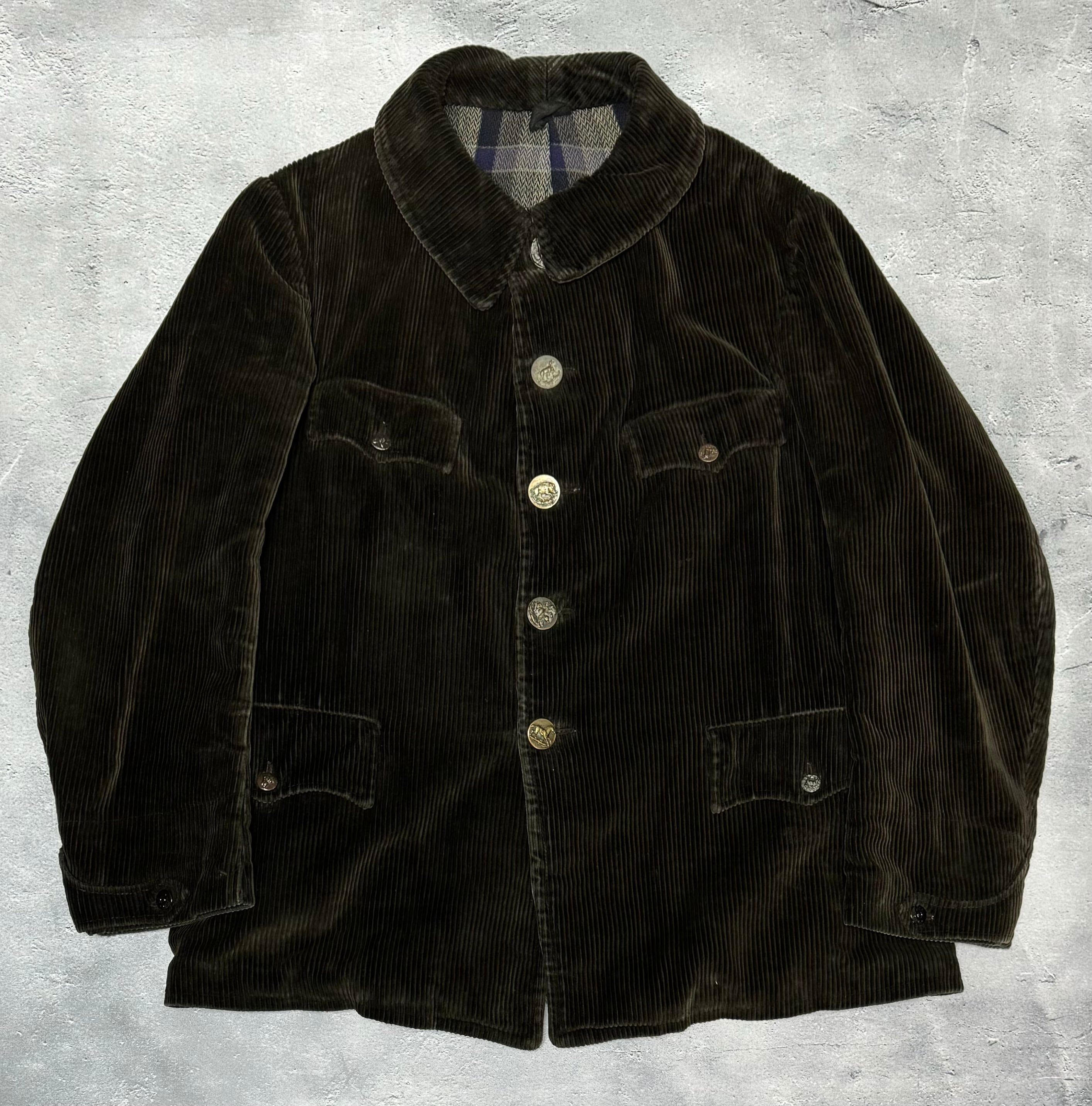 ハンティングにまつわる動物達が描かれたアニマルボタンや、裏地のチェック柄など魅力の詰まった一着です。