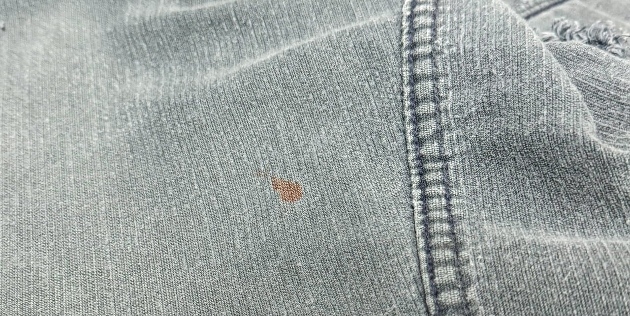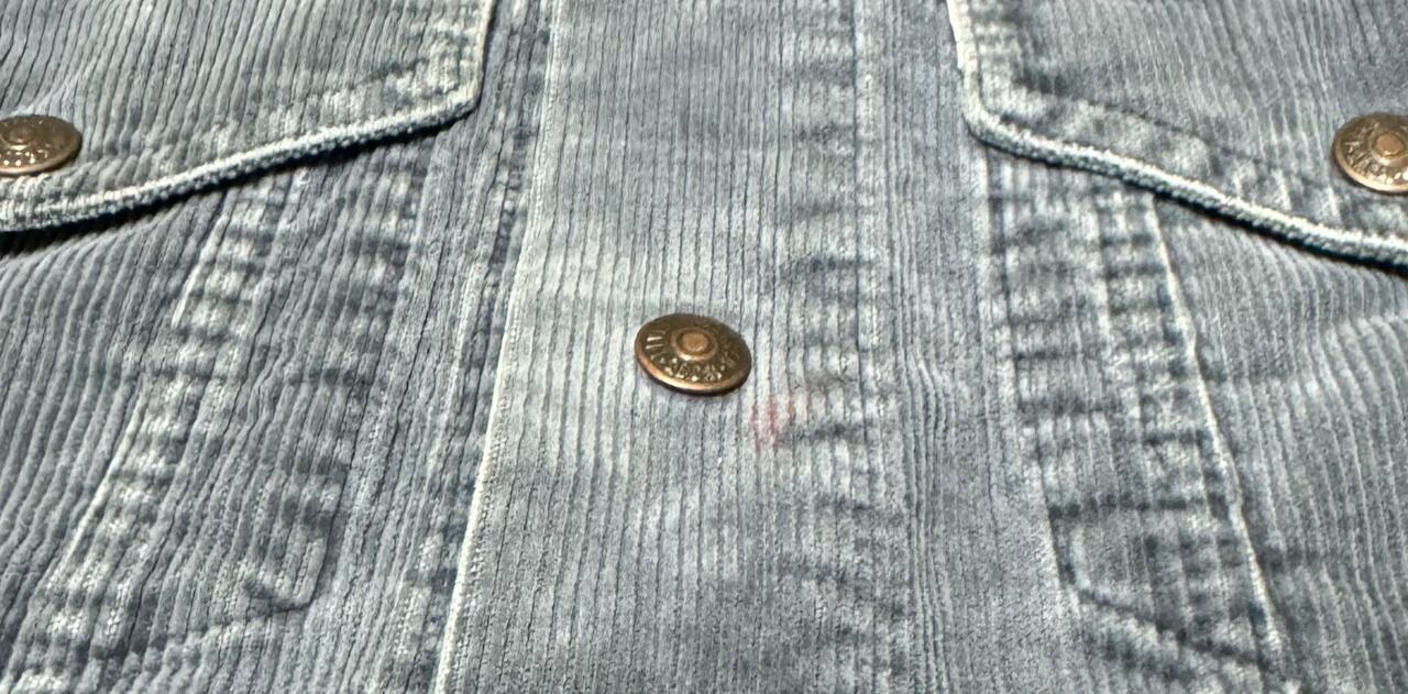 写真のように汚れ、ダメージや傷、ステッチ直し、ほつれ、褪色あり。左胸のタブは切り取られています。