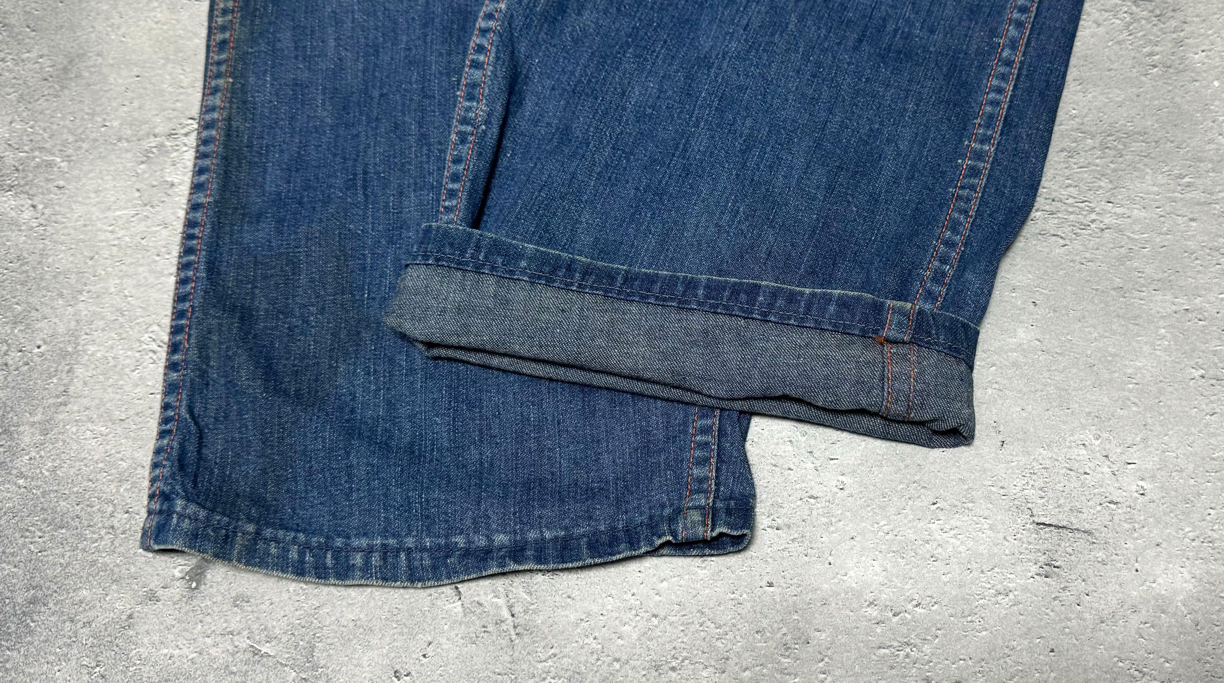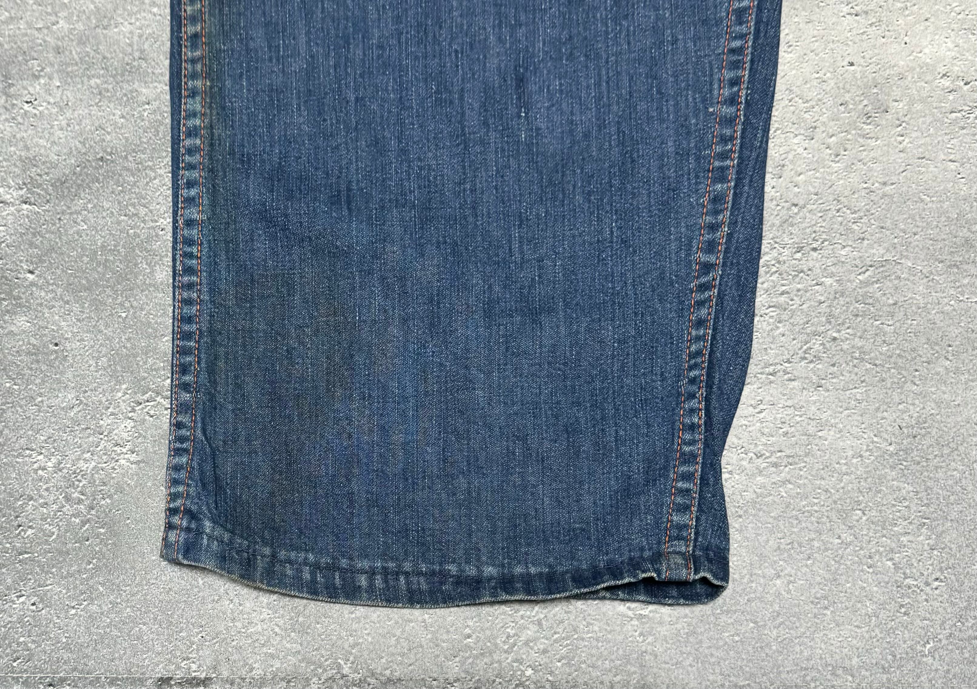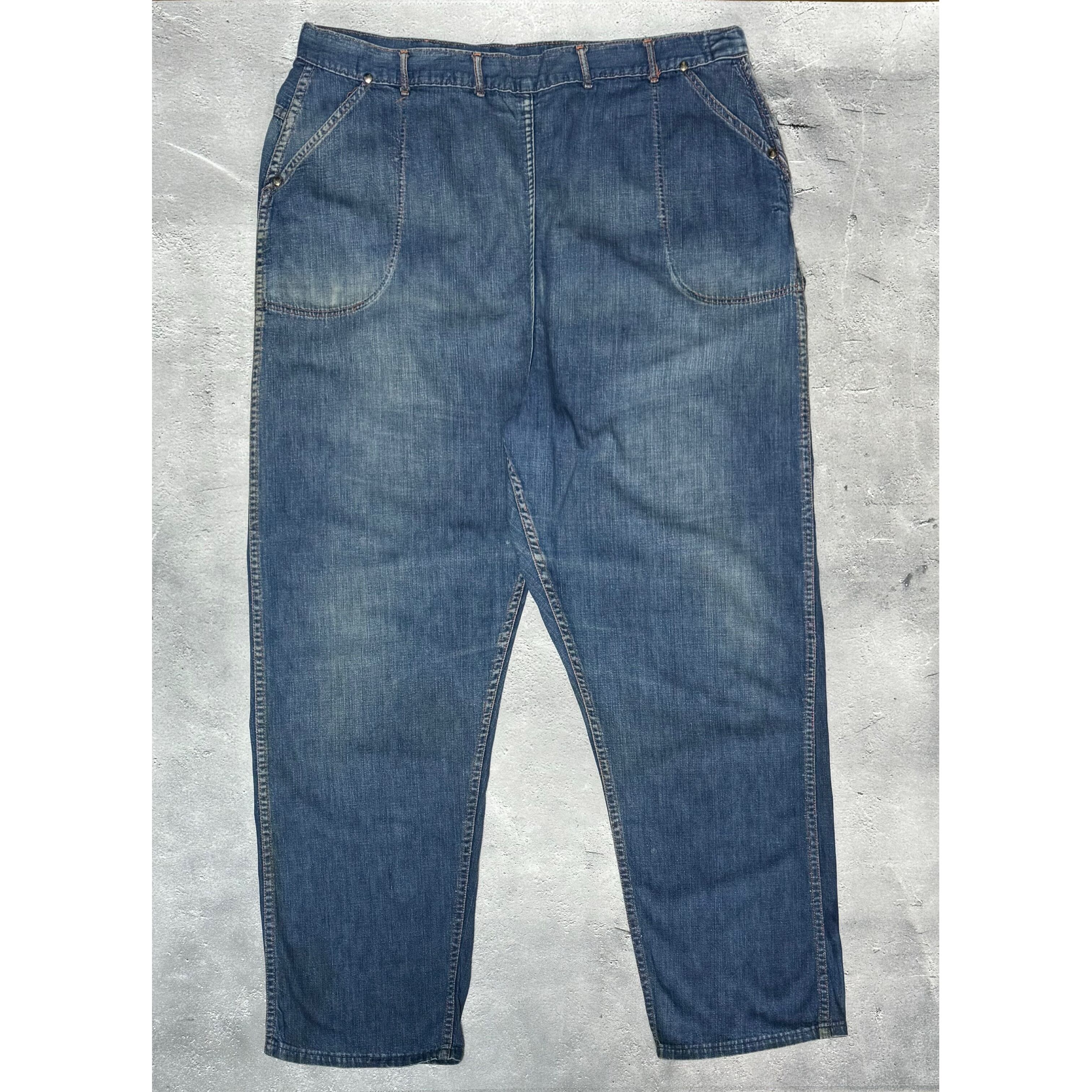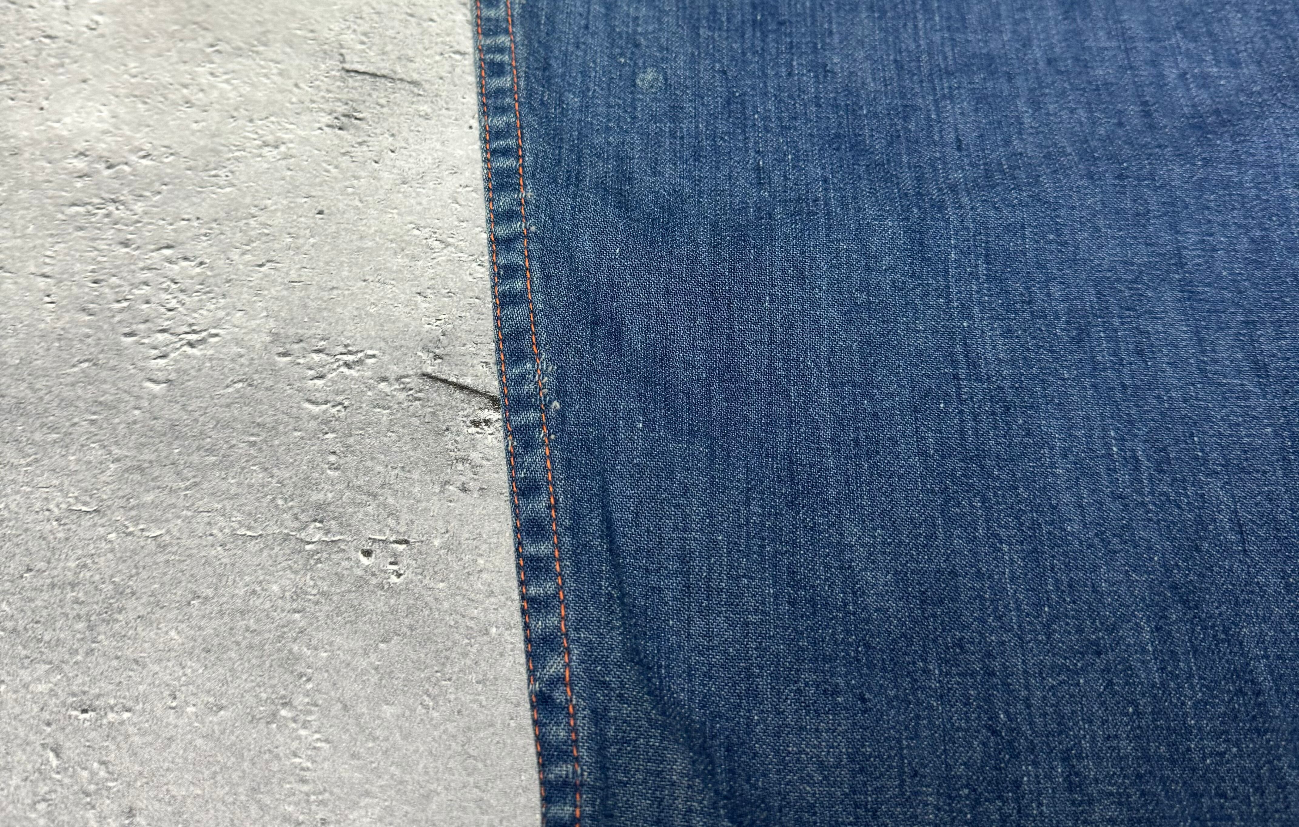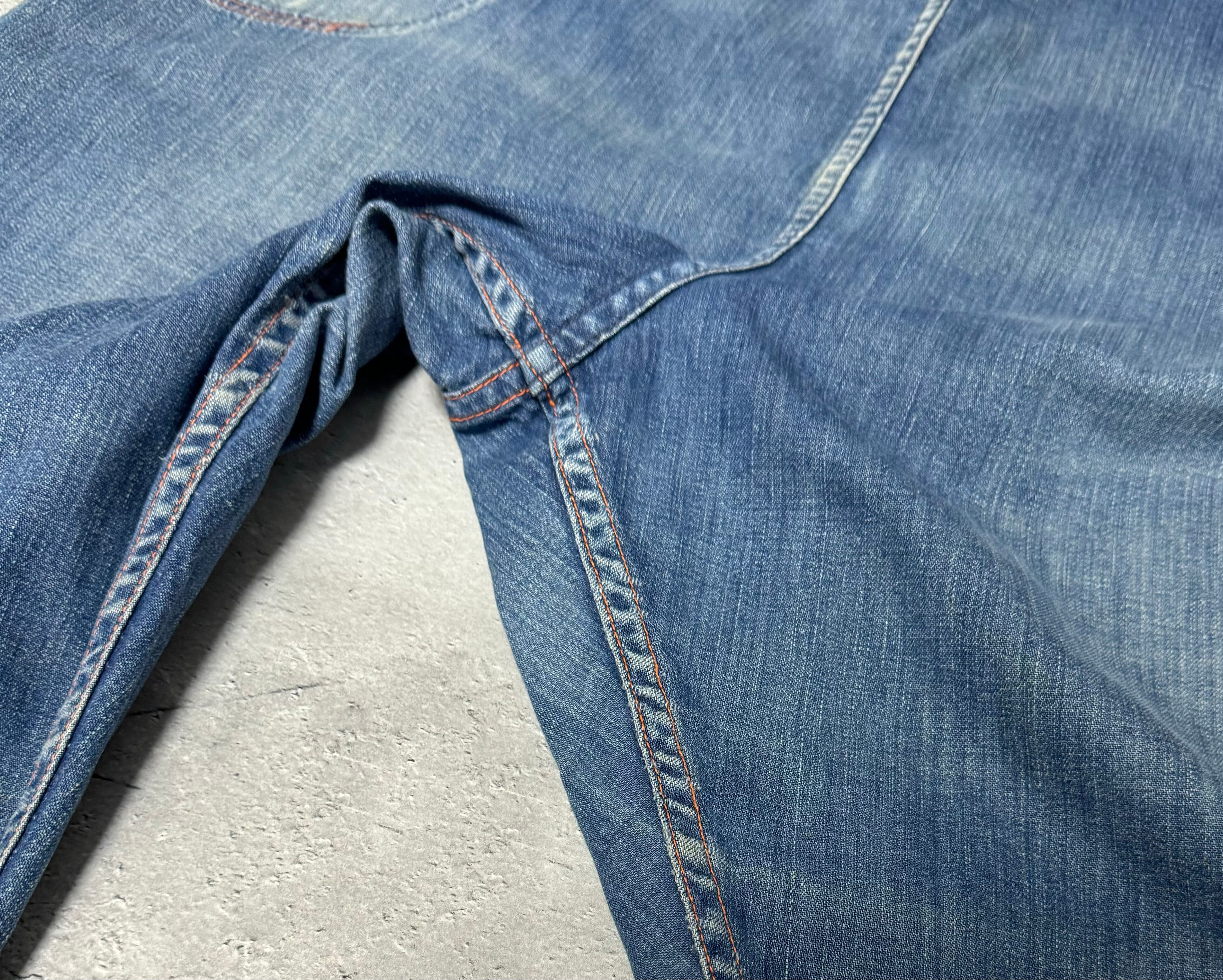 この年代のライトオンスなデニムならではの淡いブルーにフェードした個体にオレンジのステッチが特徴です。