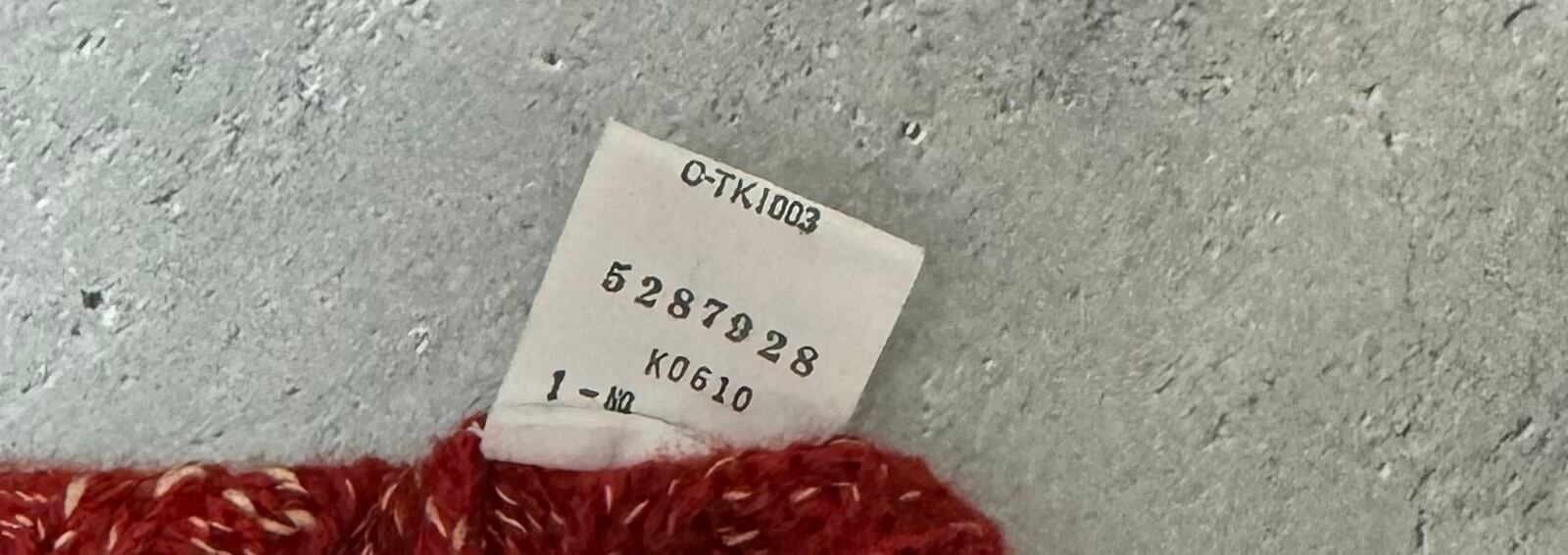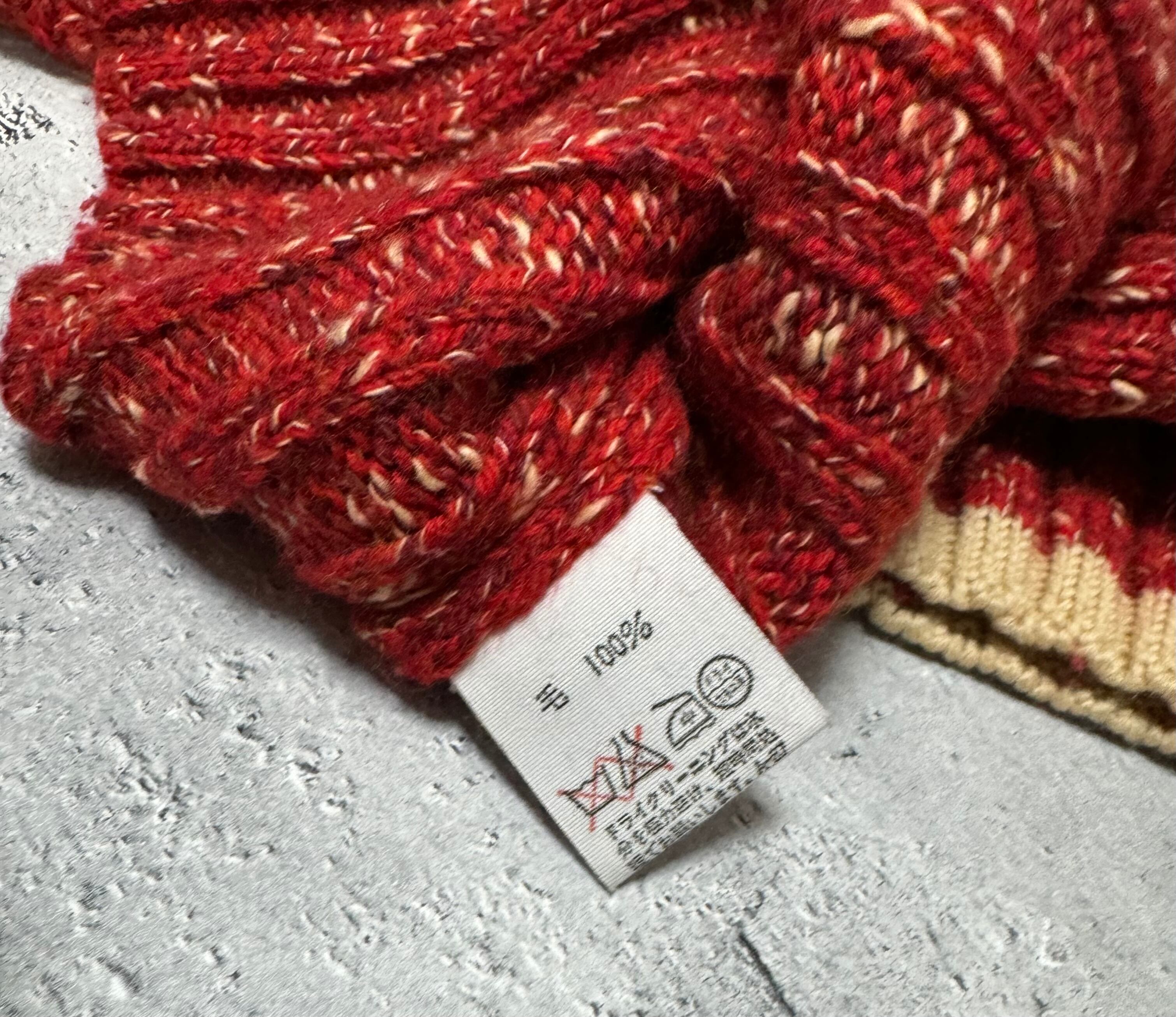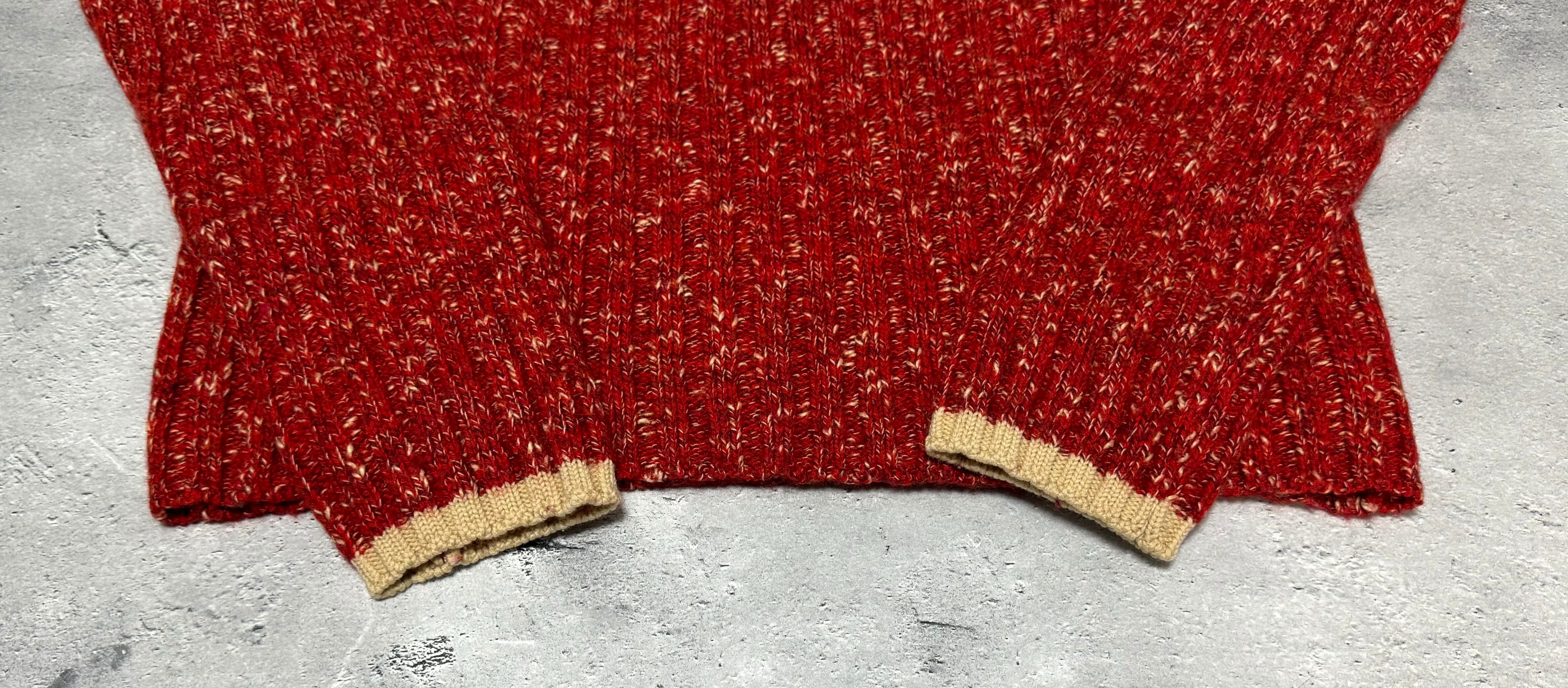 赤、エンジ、ベージュの糸を使った柔らかなミックスニット。