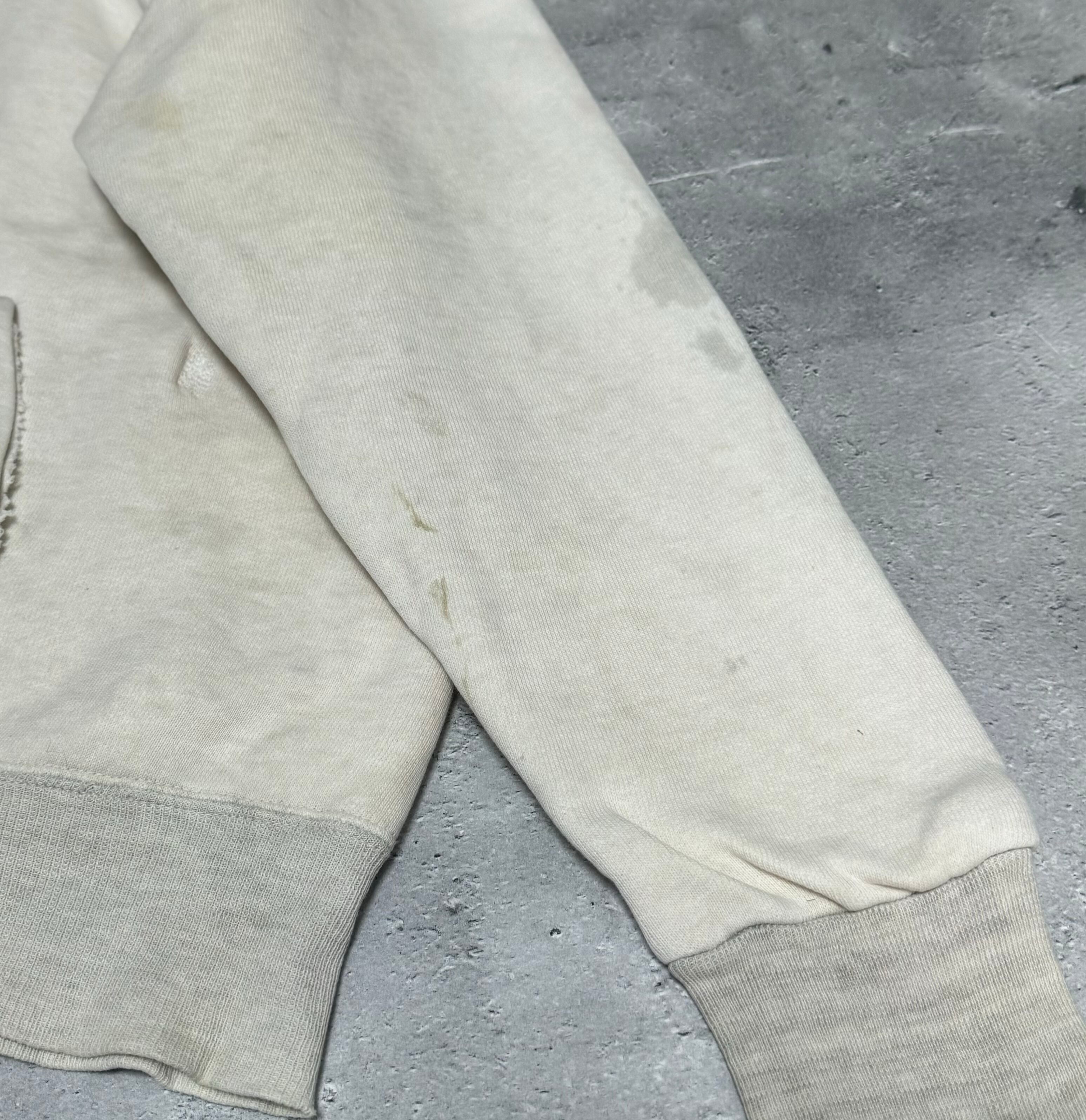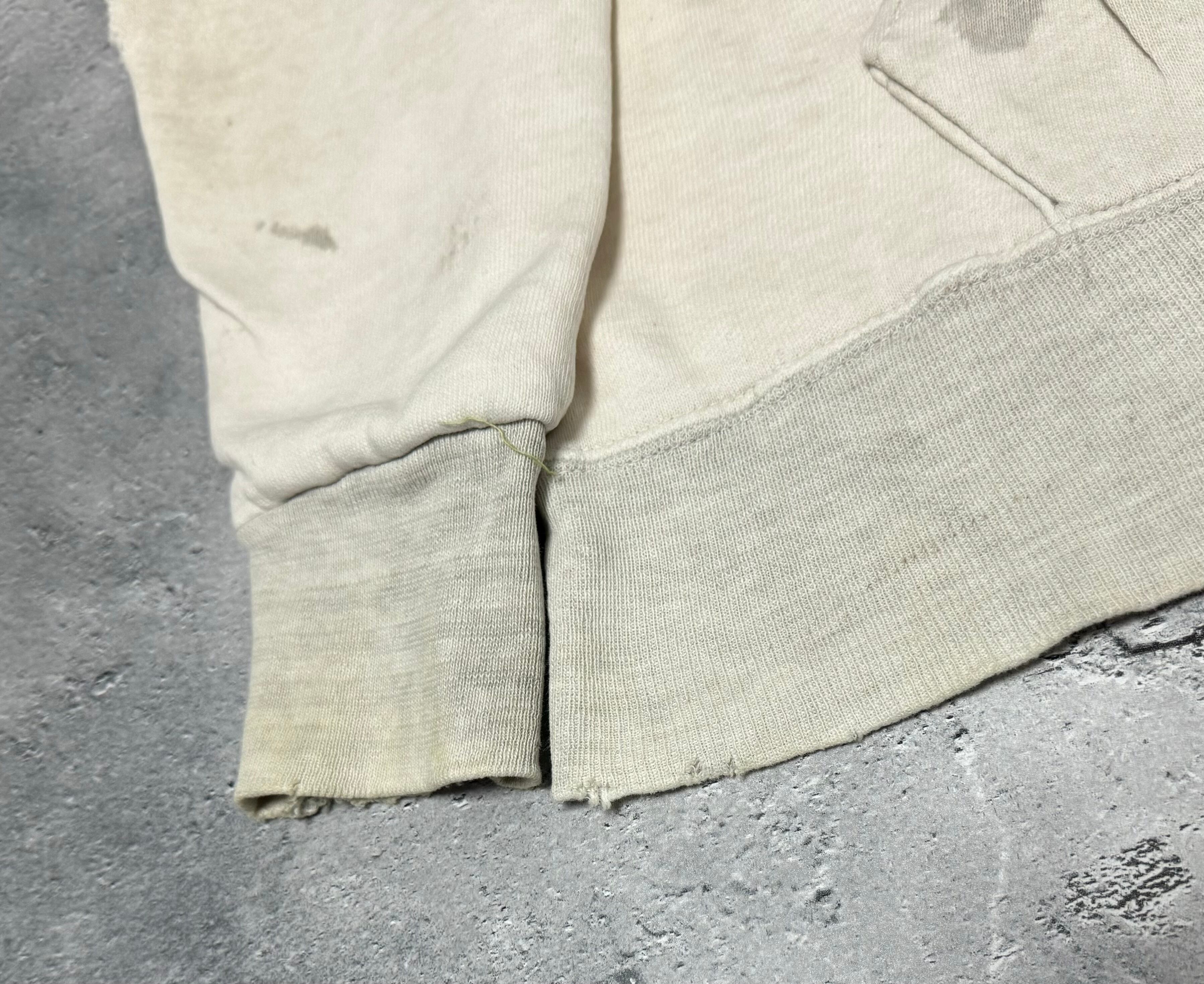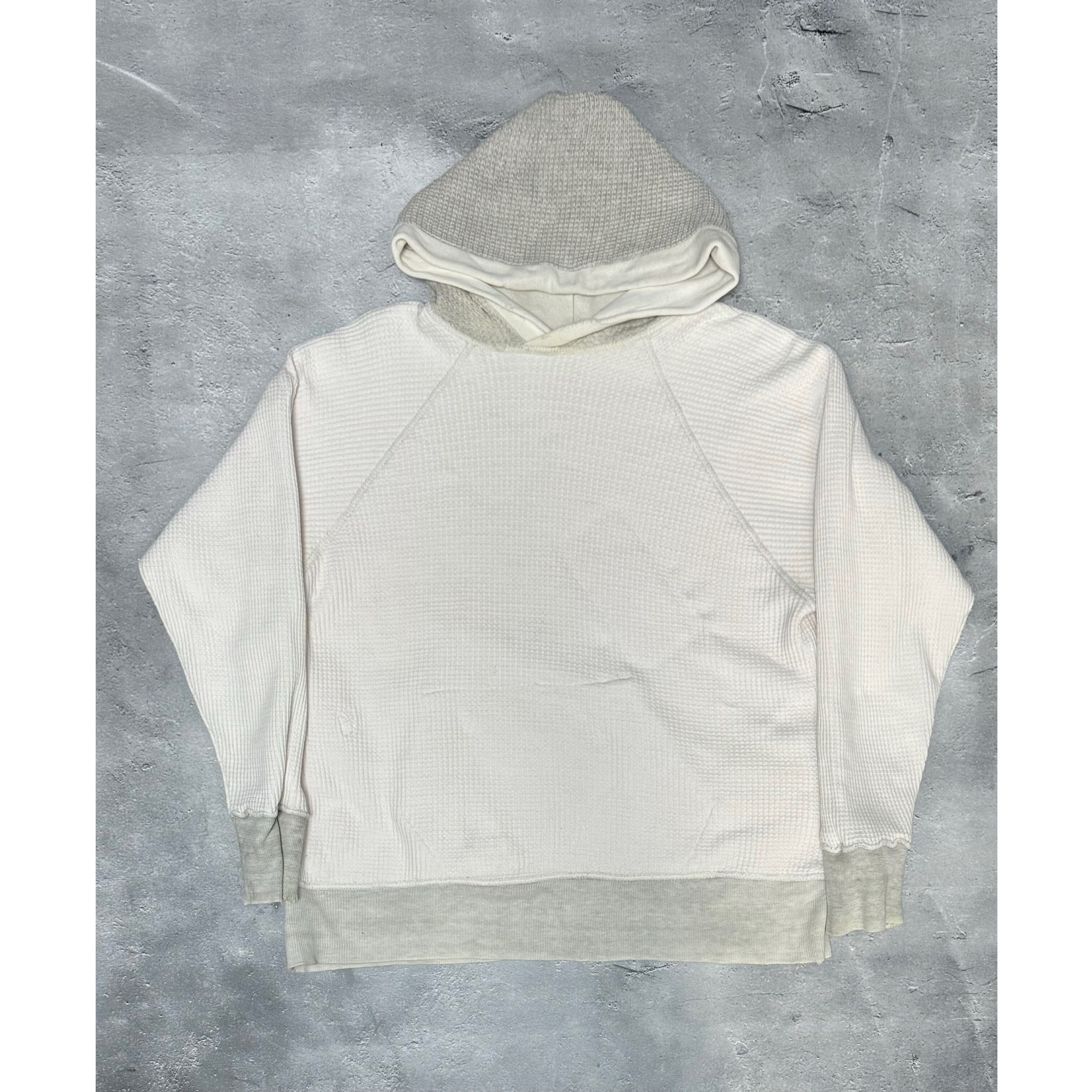 裏地はフード部分がグレー、見頃が色移りしたホワイトで、サーマル地のダブルフェイス仕様。肩はラグラン。いわゆるボロですが、雰囲気は抜群なので張り切って来てみるのもいいかなと。サイズも比較的大きめです。