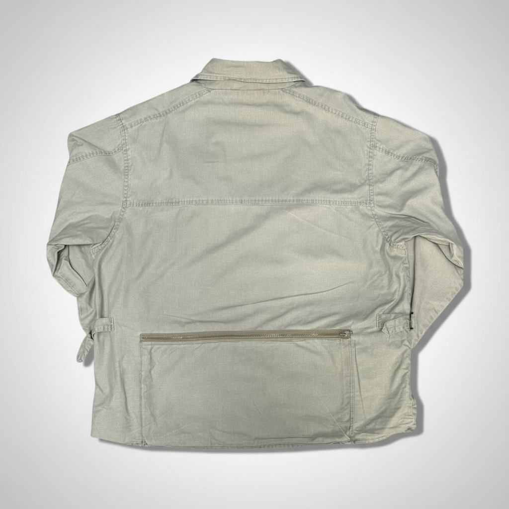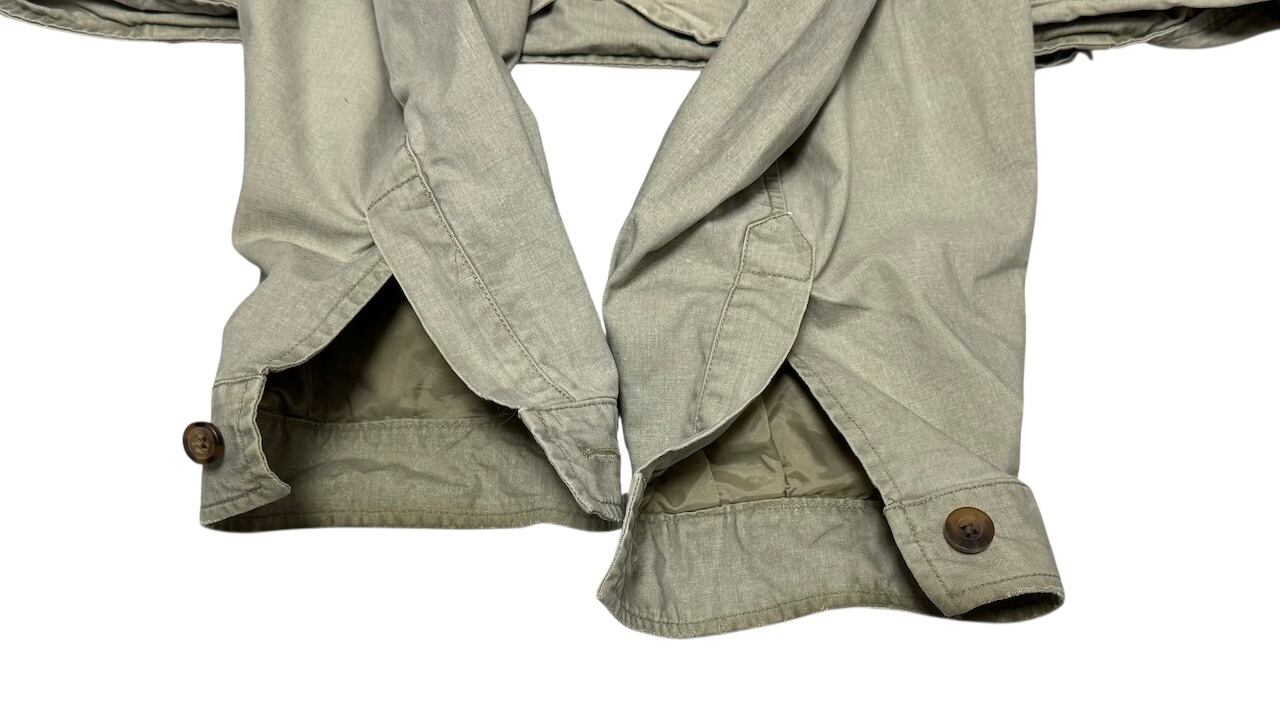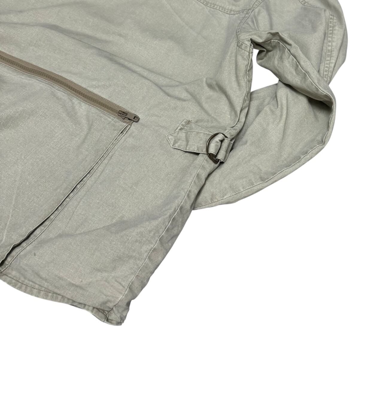 生地はポリコットンでベージュとグレーの中間色。製品染めのような生地です。裏地はメッシュ。どことなく今っぽいテンションで着れる一着かと思います。