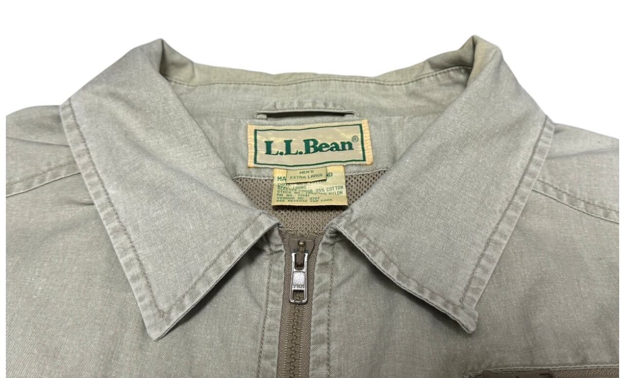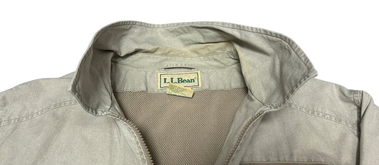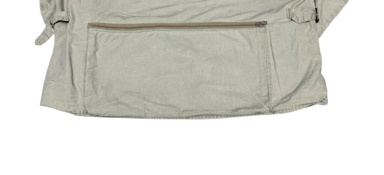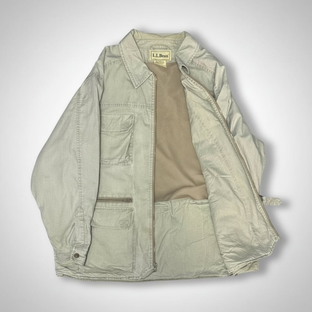 生地はポリコットンでベージュとグレーの中間色。製品染めのような生地です。裏地はメッシュ。どことなく今っぽいテンションで着れる一着かと思います。