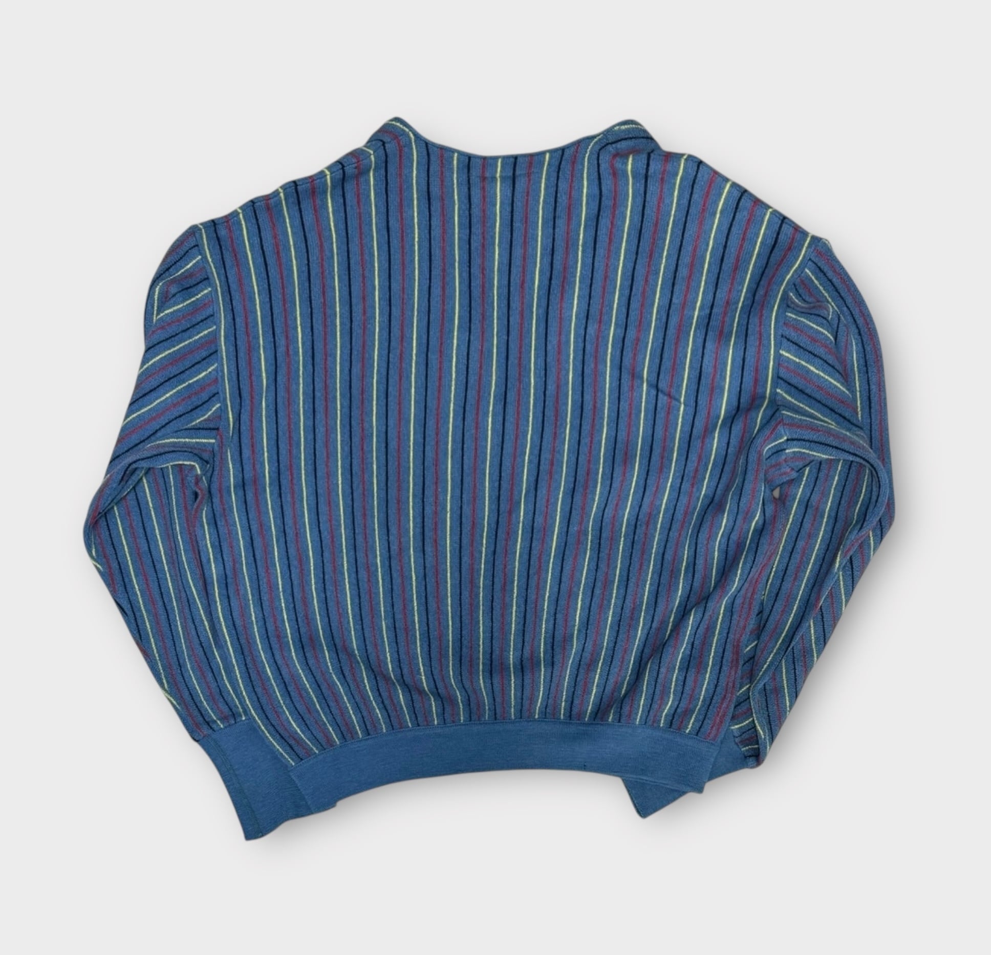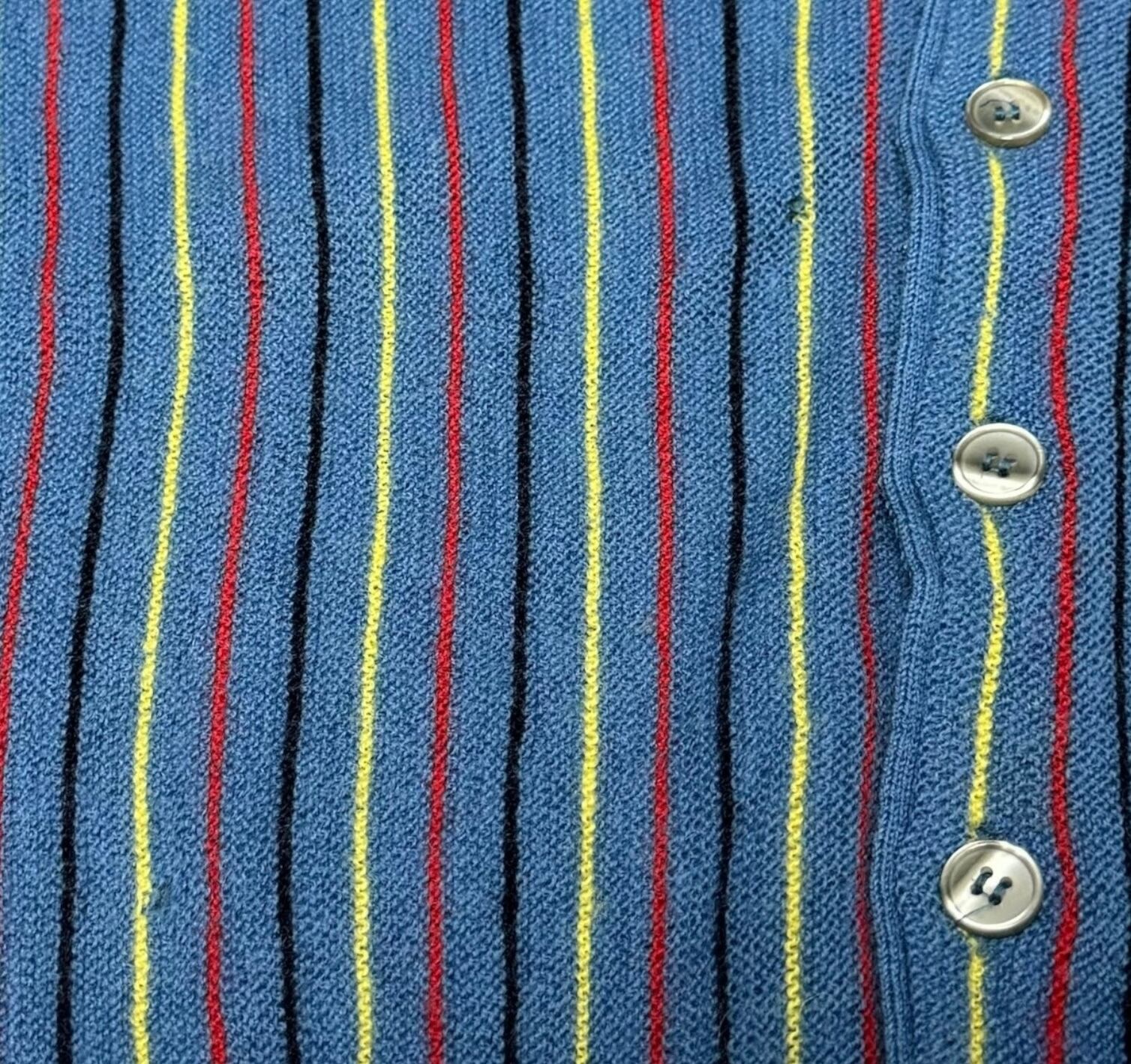 70年代ごろのフランス製Lacosteのウールカーディガン。ブルーベースにイエロー、レッド、ネイビーの高配色のストライプ。身幅広く着丈の短い、今着たいシルエット。