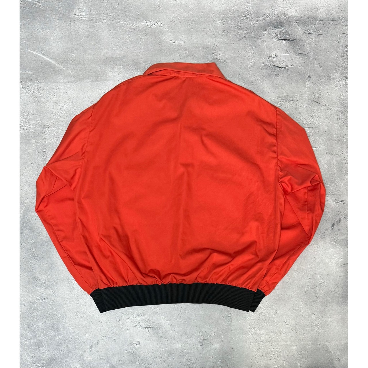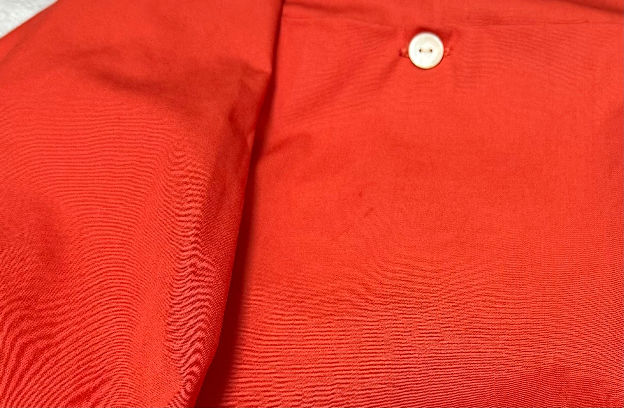コットンベースでオレンジがかった朱赤色。袖と裾は黒のリブ。襟付きのプルオーバーで、胸の切り替えが特徴的。ボタンを開けるとサイドポケットになっています。