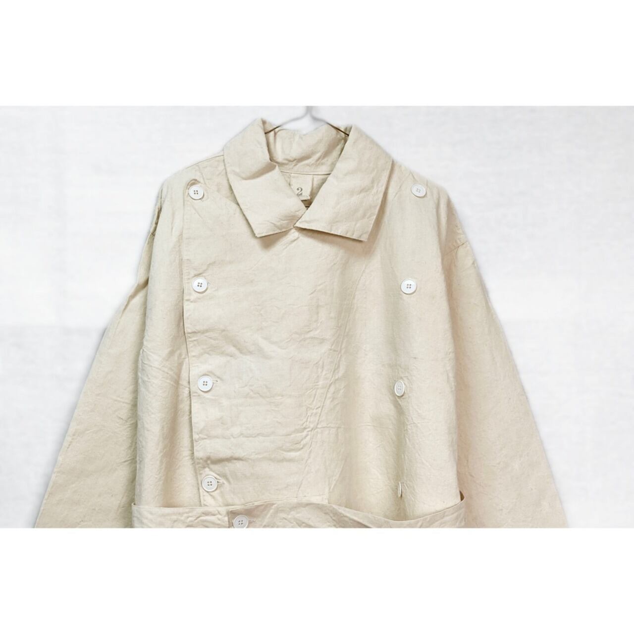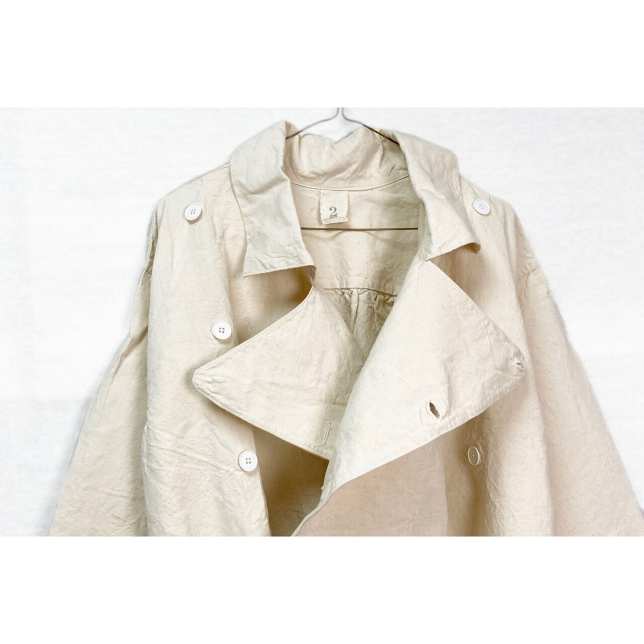 ダブルでロング丈とモードな雰囲気も漂いますが、優しい生成りカラーやドローコードのおかげで纏まりやすいと思います。見頃が大きめなので、冬場にはオーバーコートとしても。