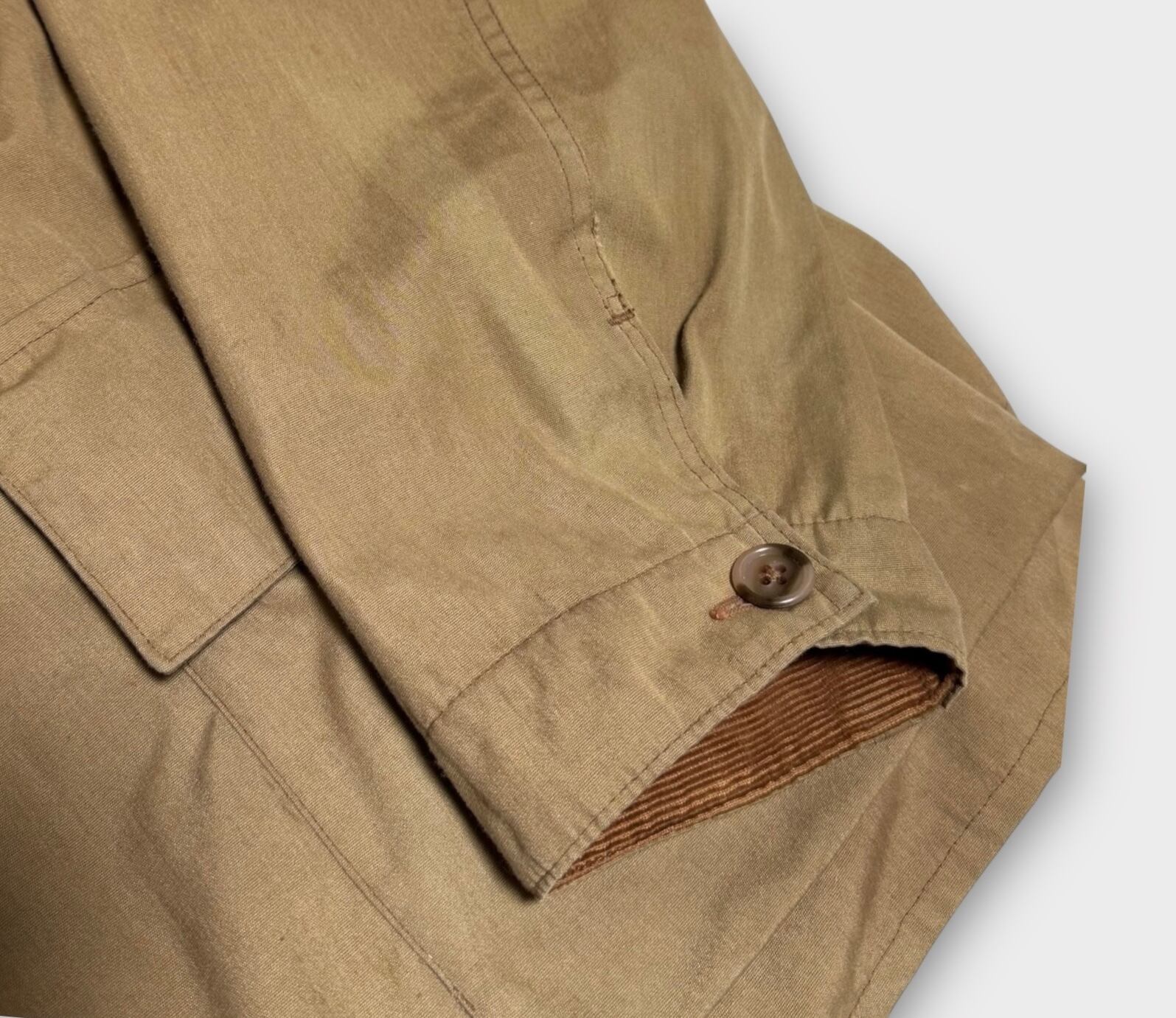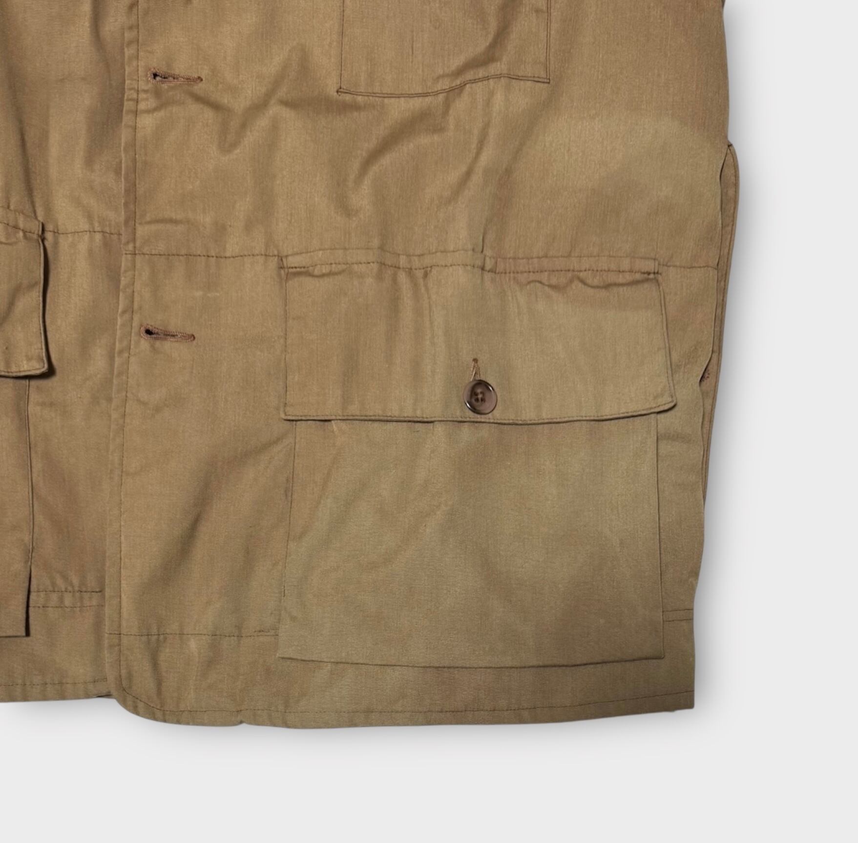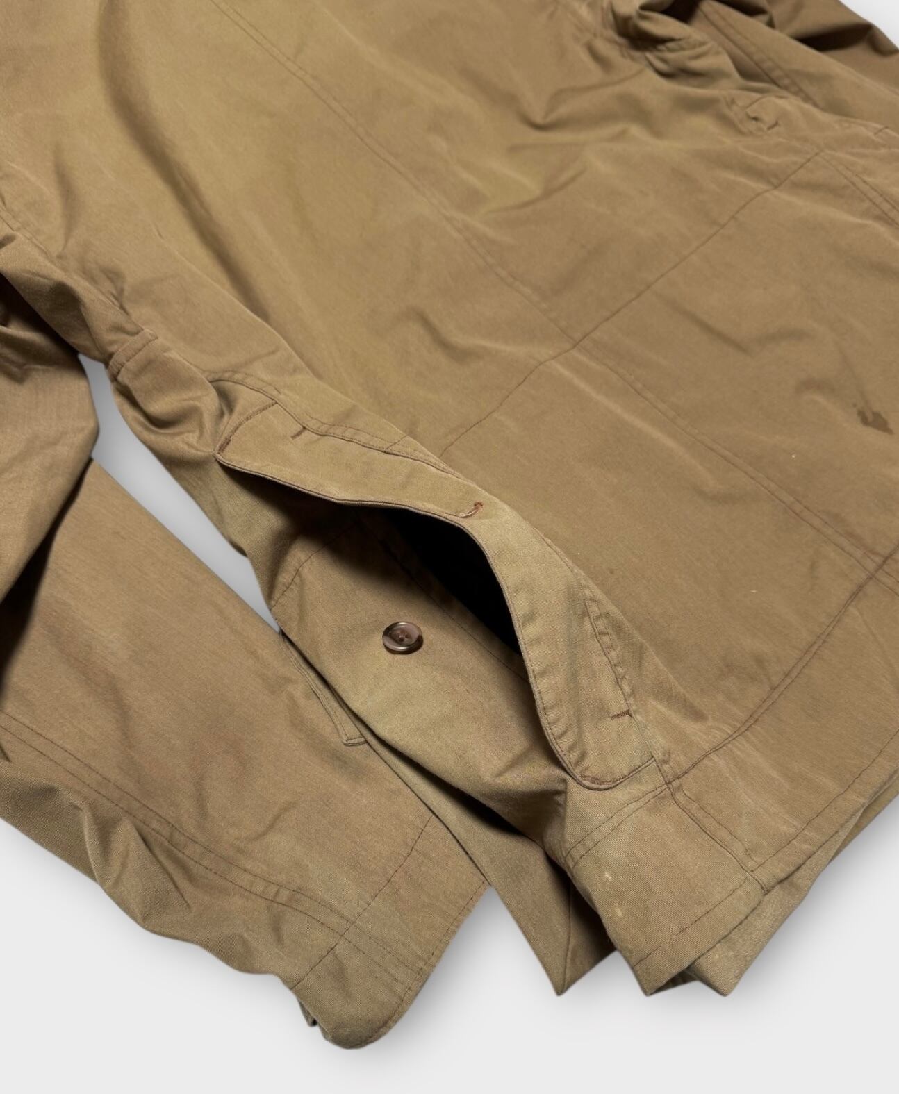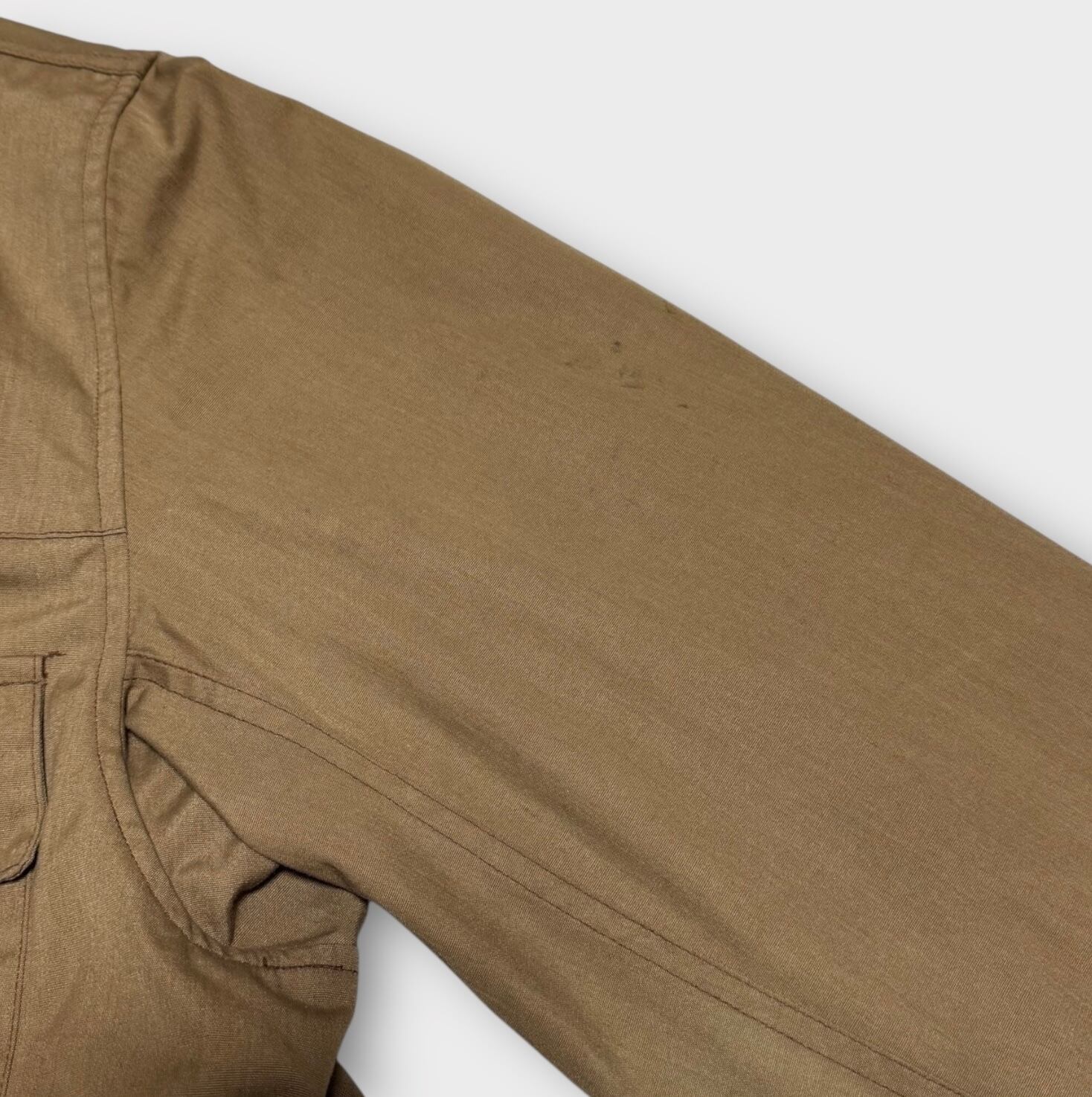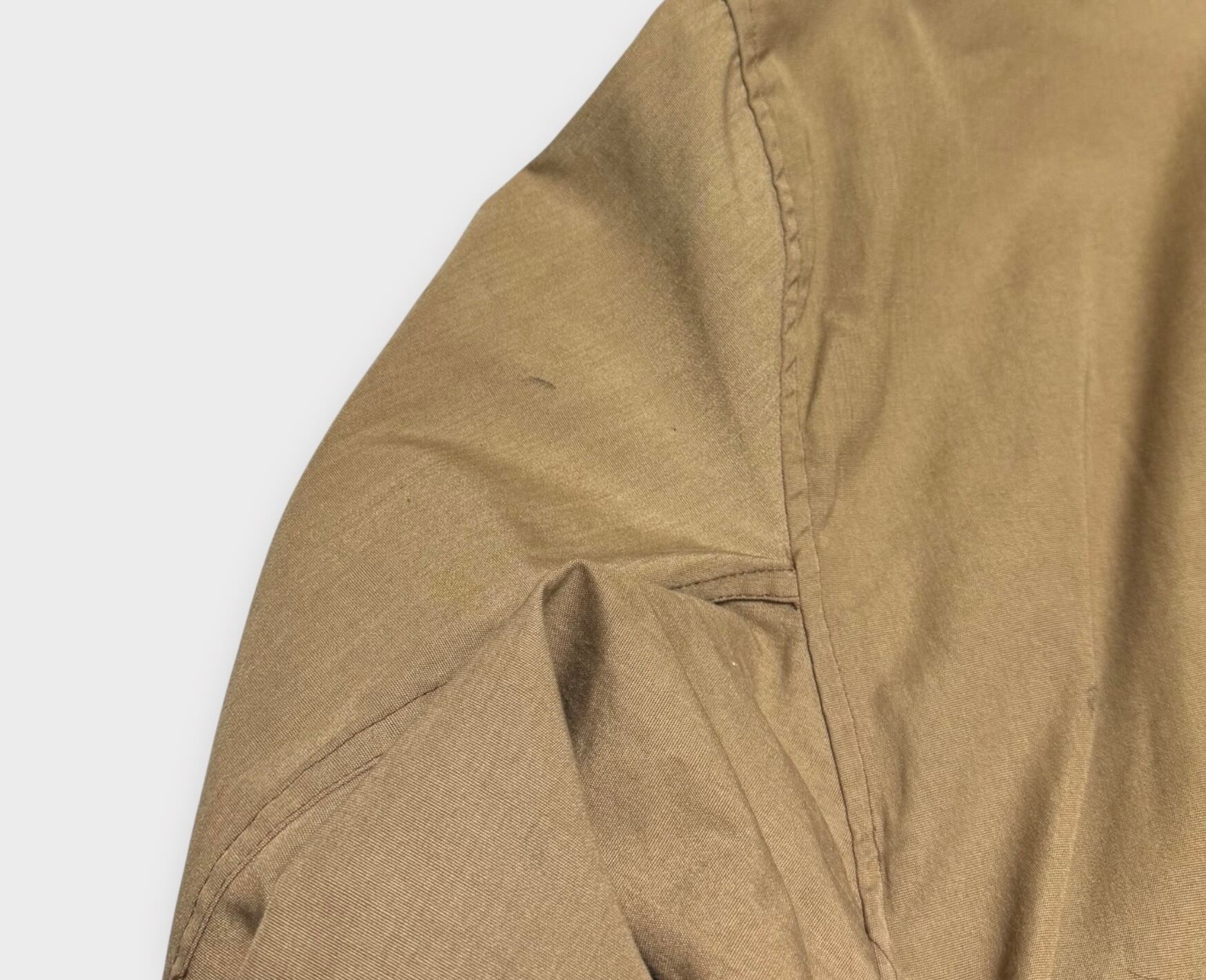 袖に汚れ、左サイドポケットには色褪せがあります。また、タグに色移りが見られます。詳細は画像をご確認ください。