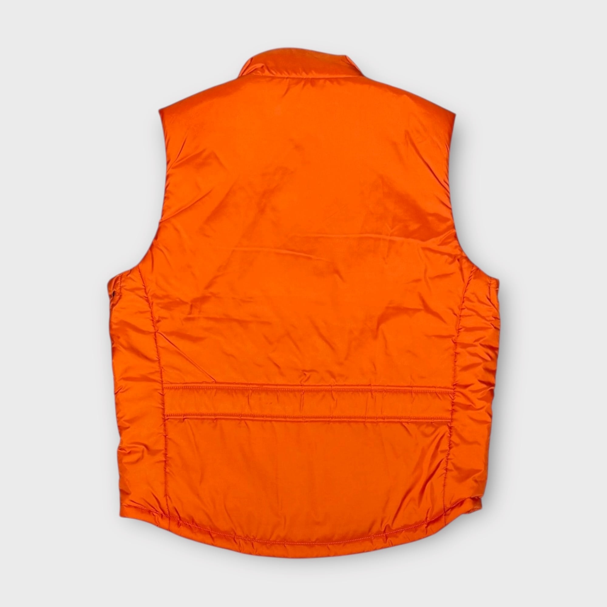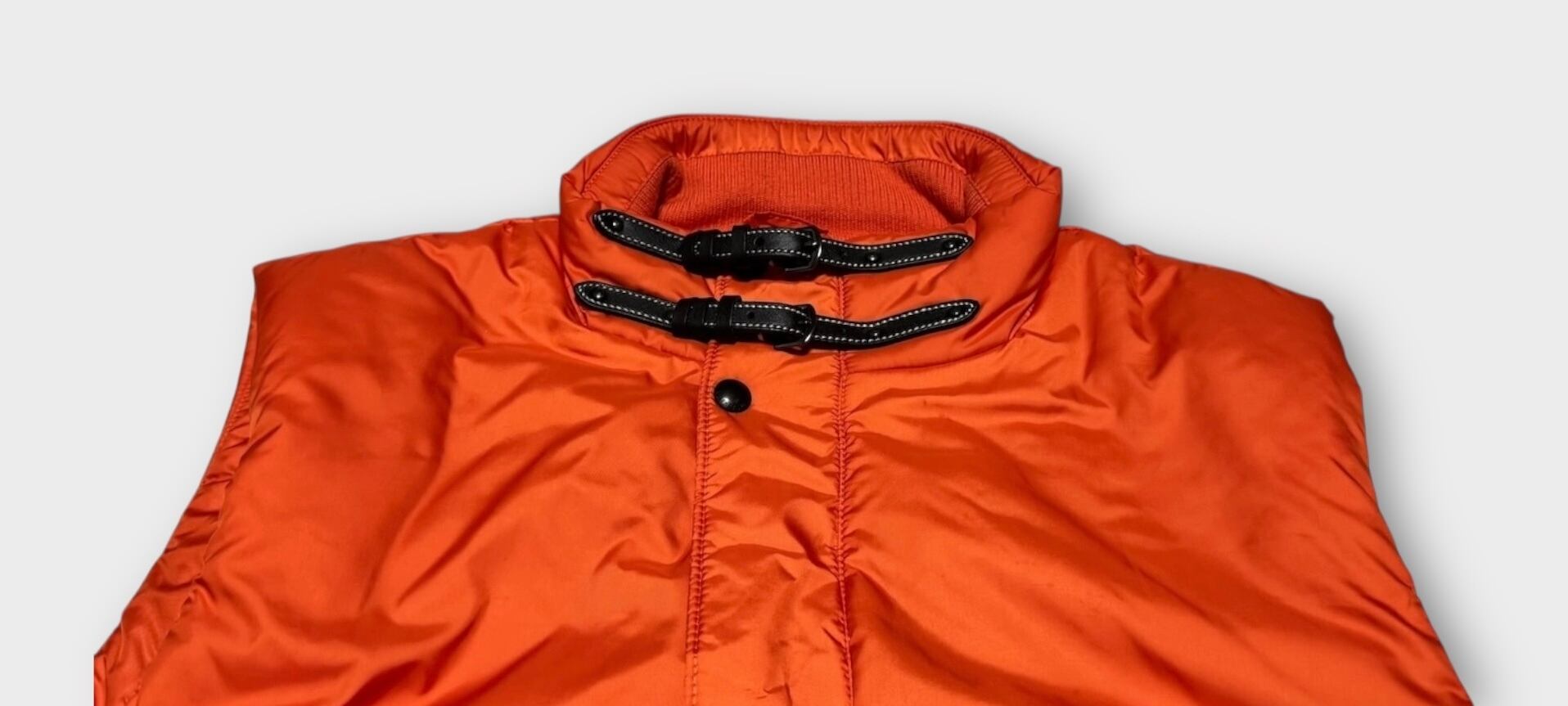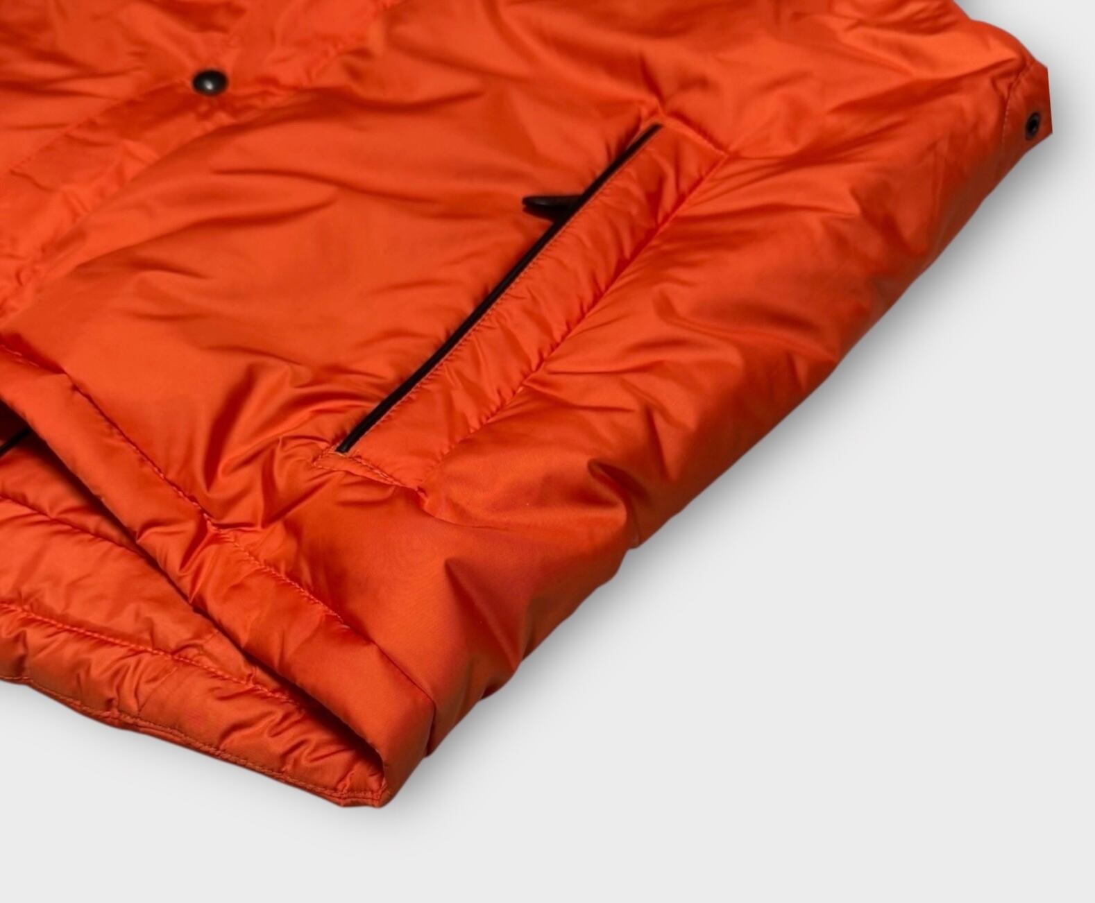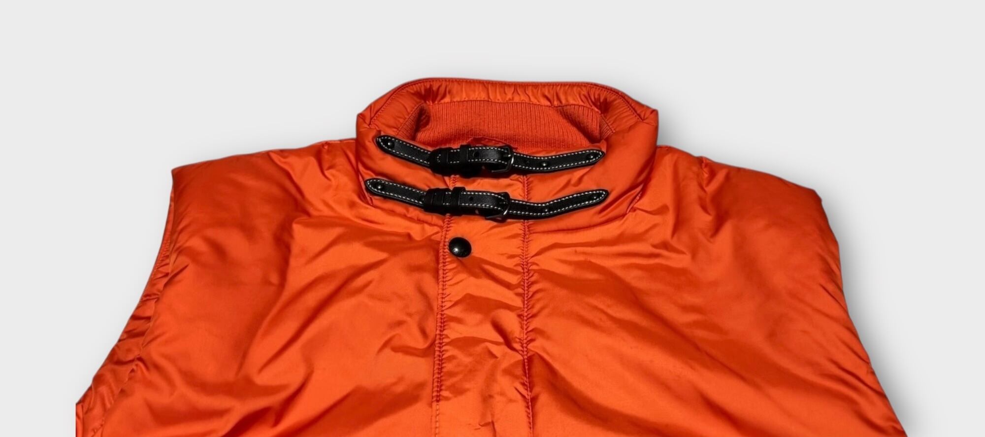 鮮やかなオレンジカラーが目を引く一着で、首元にはファイヤーマンジャケットを思わせるフックがアクセント。