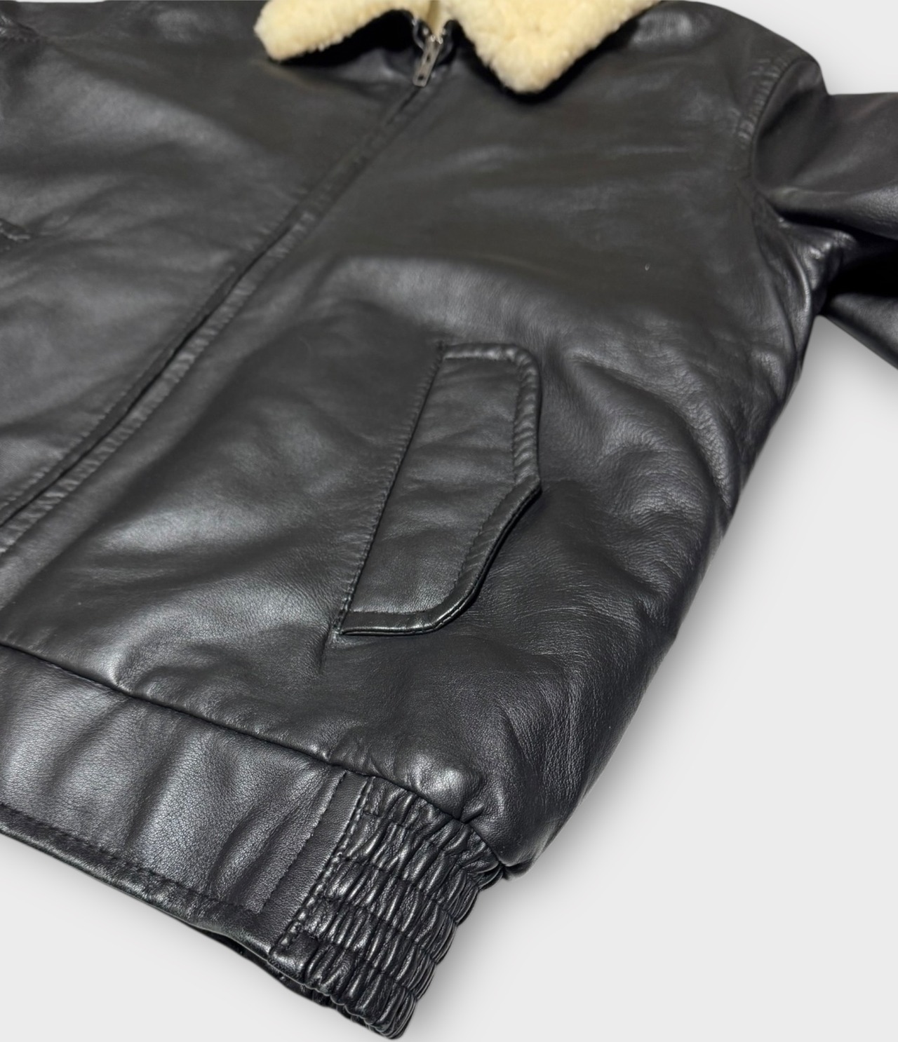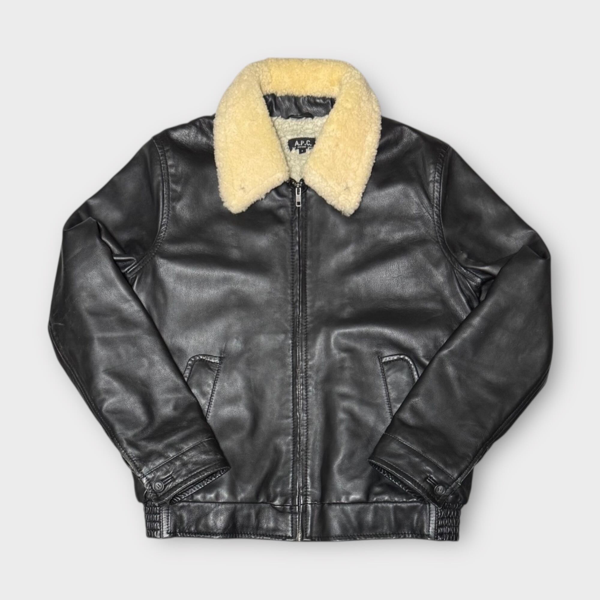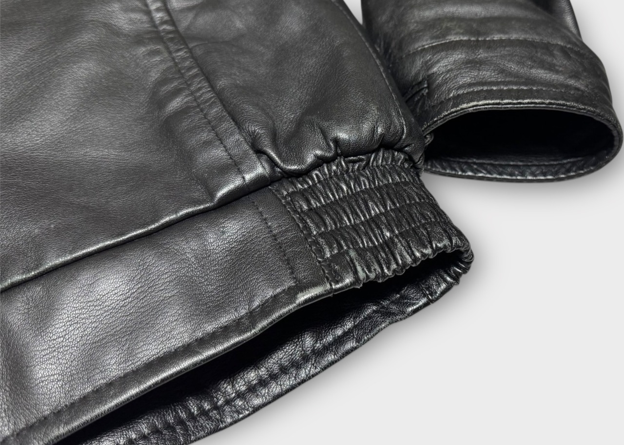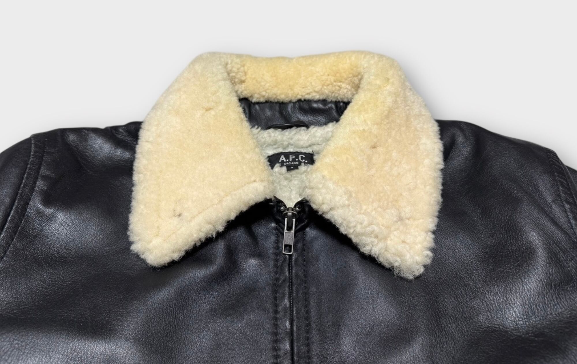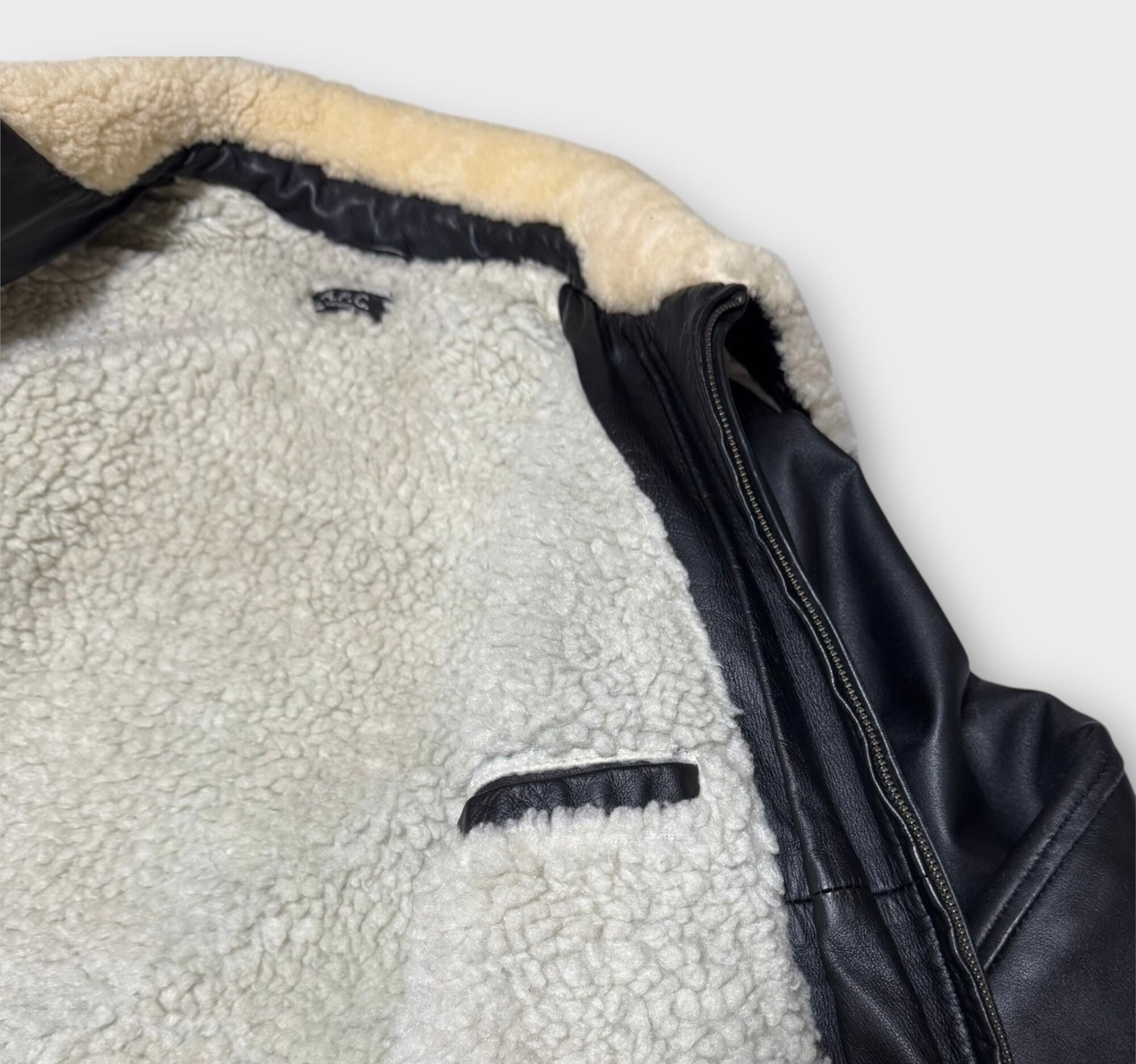 2000年代のA.P.C製ラムレザージャケットです。当時はタイトなサイジングが主流だった中で、サイズ3は希少な存在といえるでしょう。表地には柔らかく光沢のあるブラックのラムレザーを使用し、裏地と襟はボア仕様になっております。