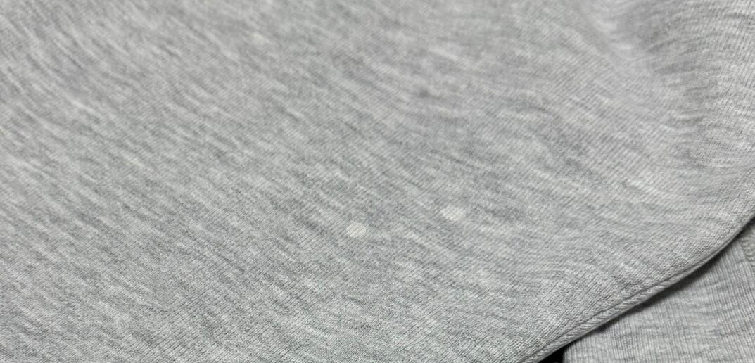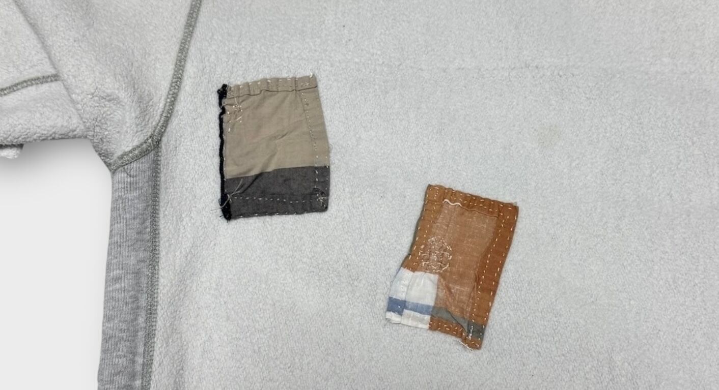 胸元に2箇所の補修跡があり、首元と裾のリブにはスレや小傷があります。右袖にはわずかなブリーチ跡が見られ、細かなほつれもございます。味のある風合いを楽しみたい方におすすめの一着です。